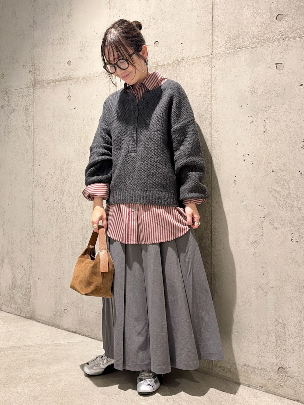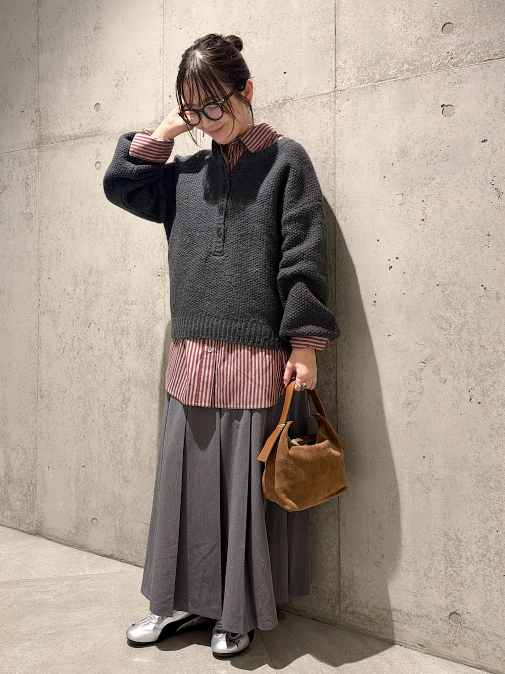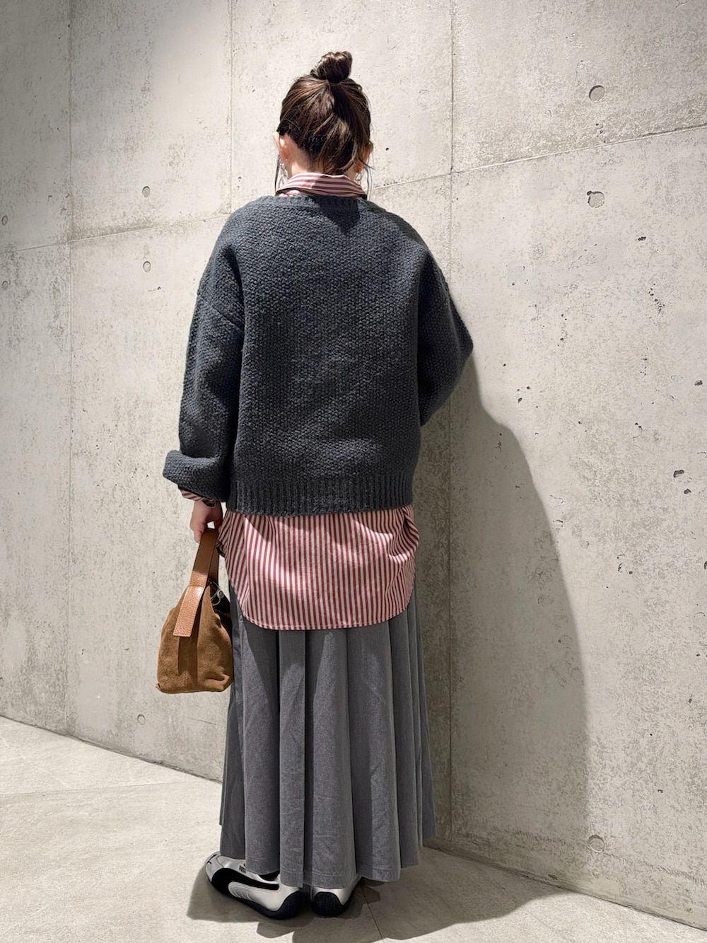 今回は、ストライプ柄のシャツと合わせたレイヤードスタイル。
