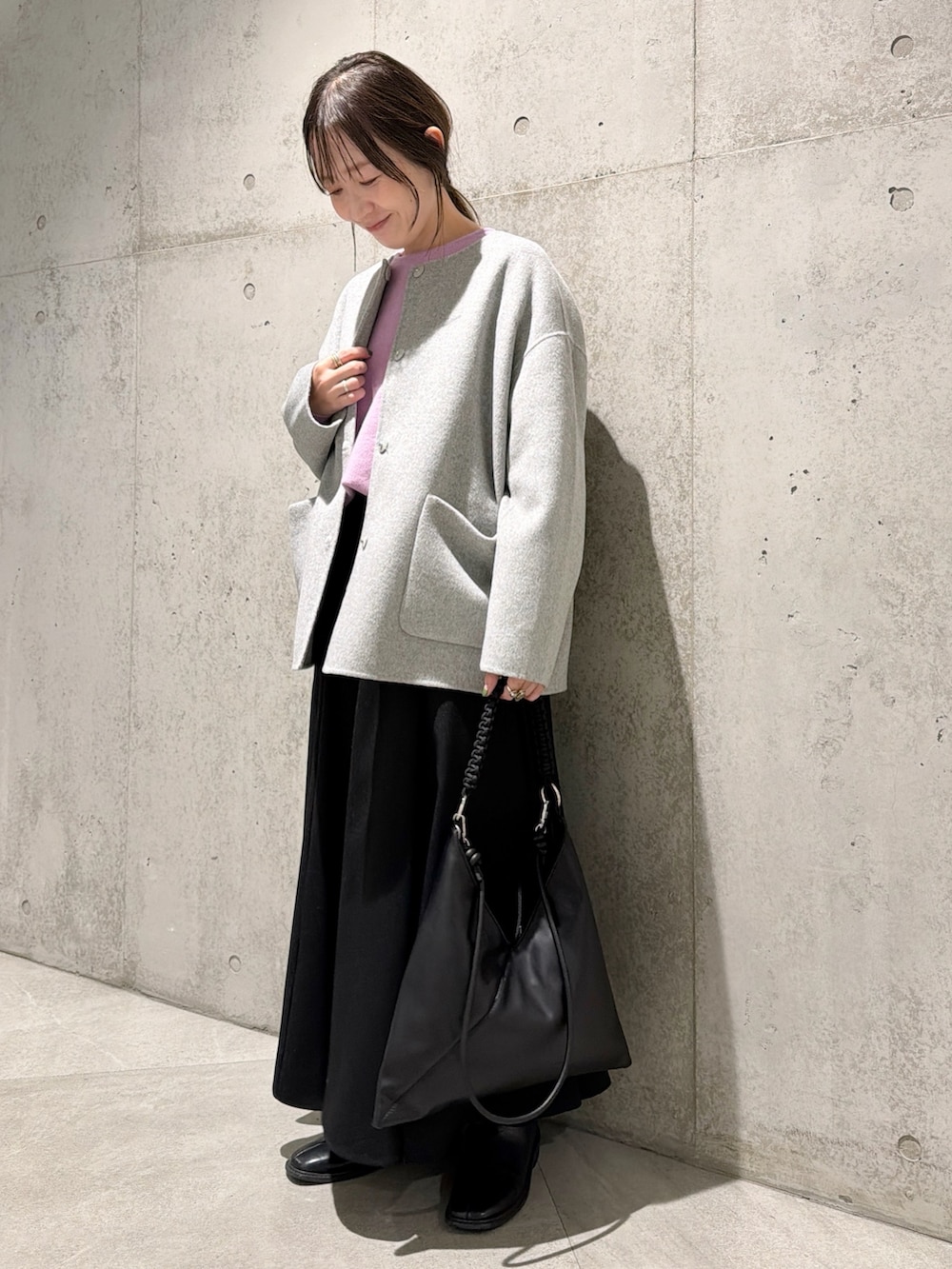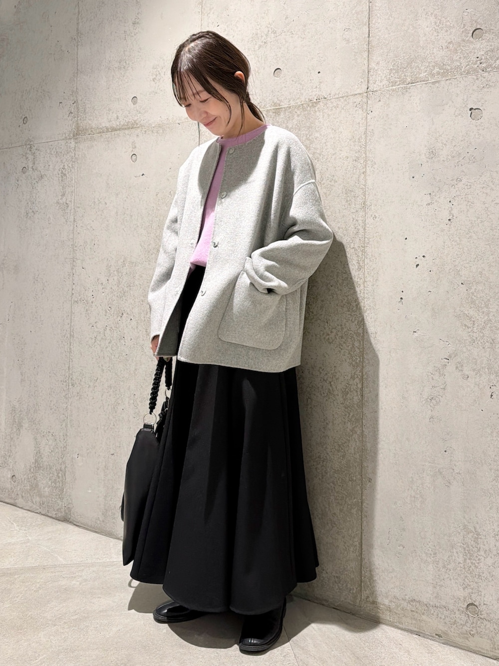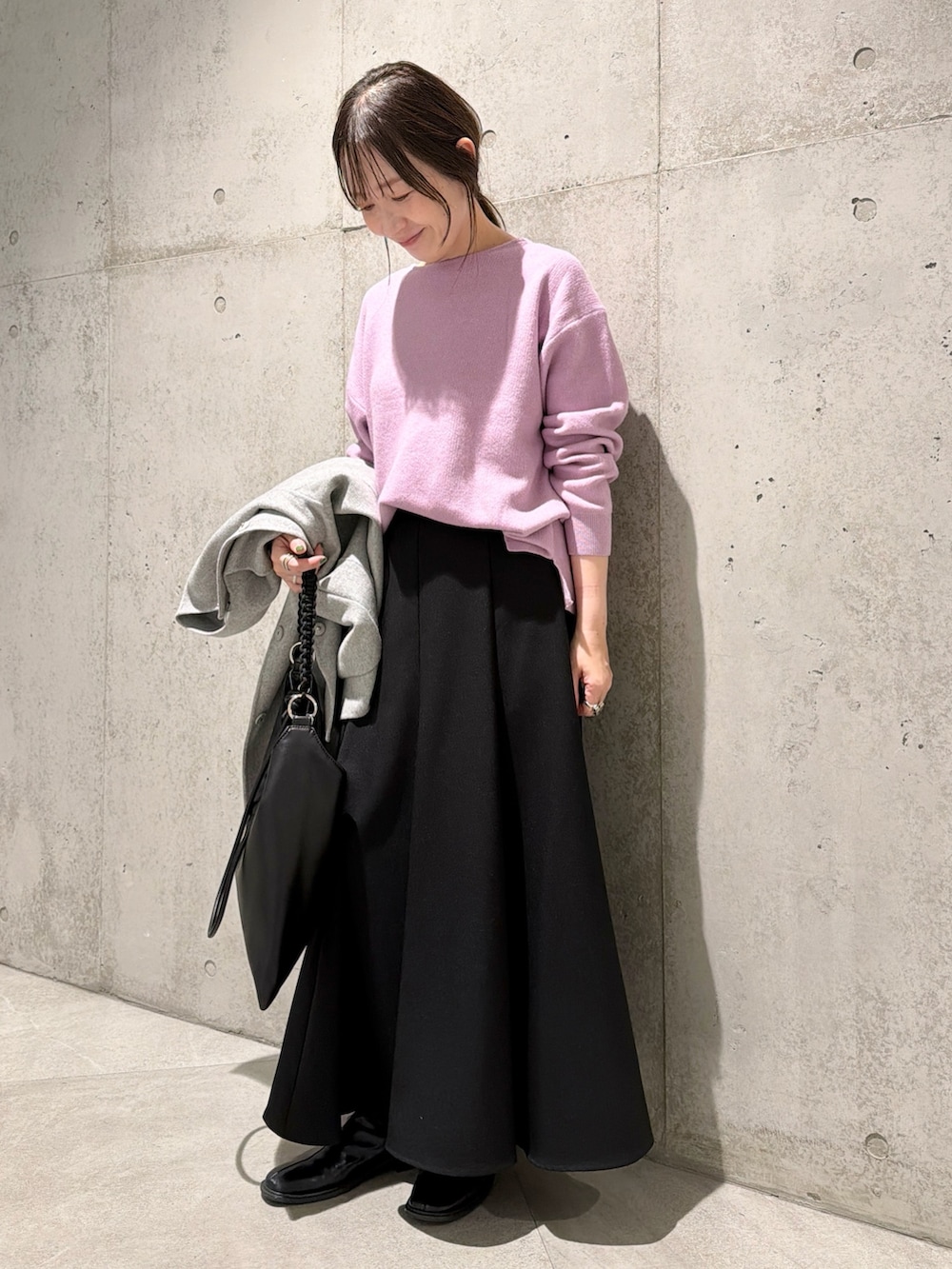 今回は、ライラックカラーのニットをアクセントにした、キレイめコーディネートです。