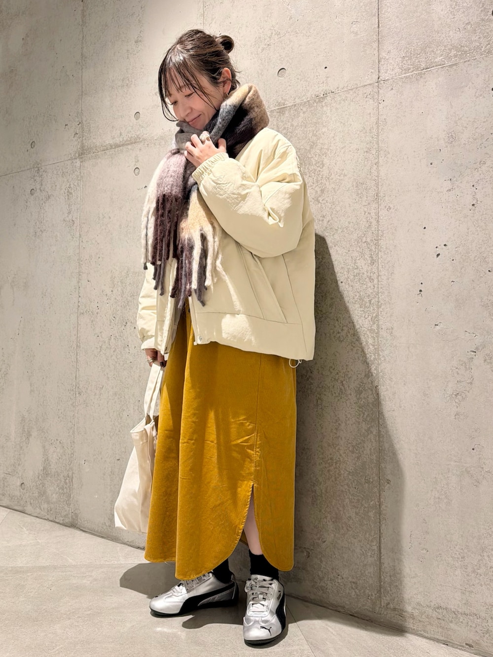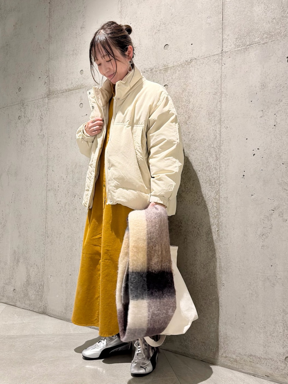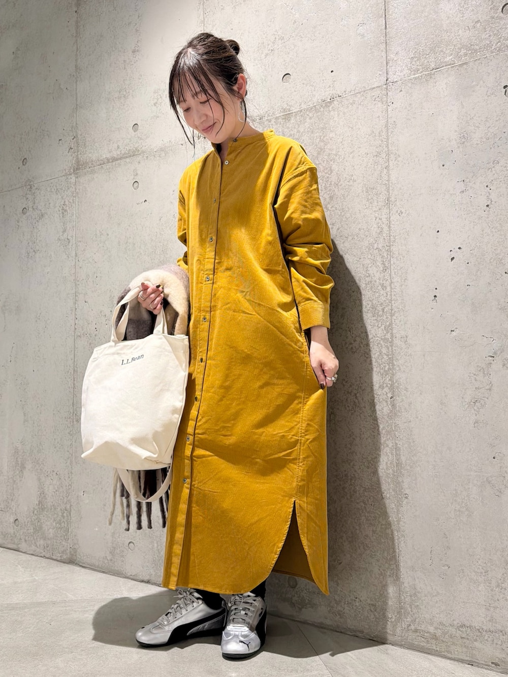 今回は、インパクトのあるマスタードカラーのワンピースと合わせてみました。