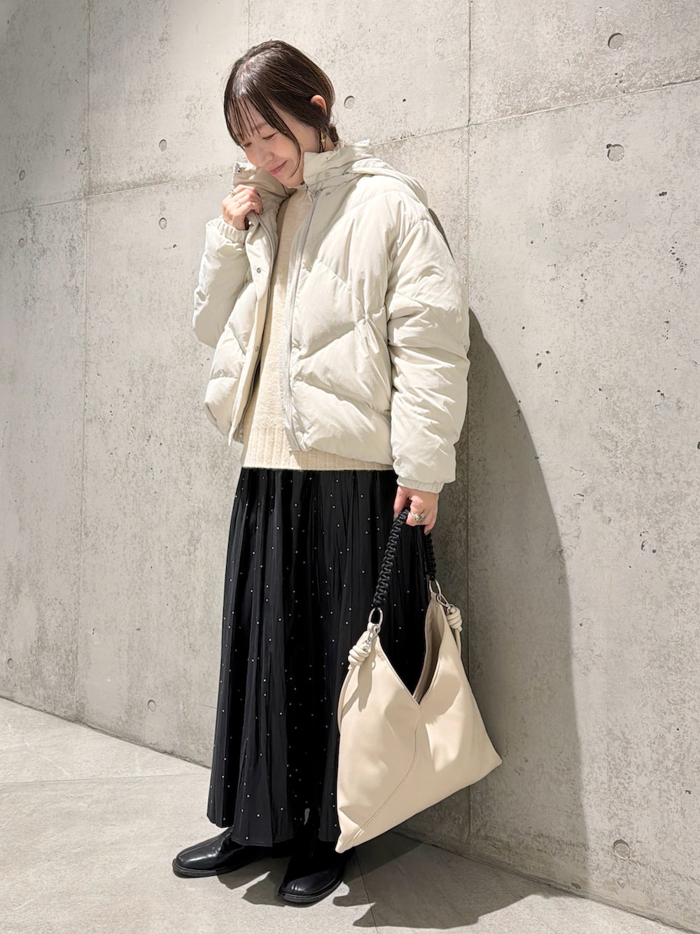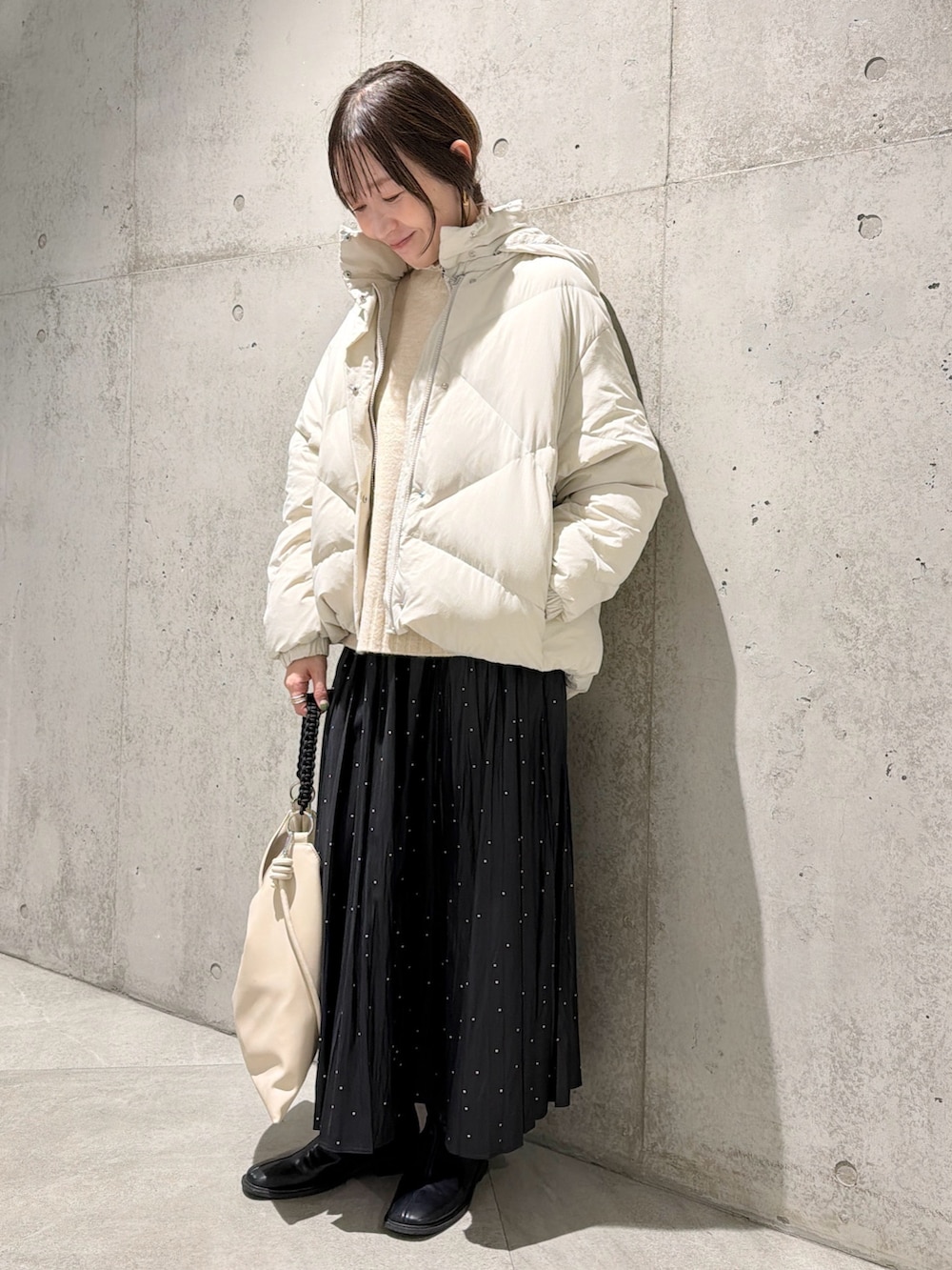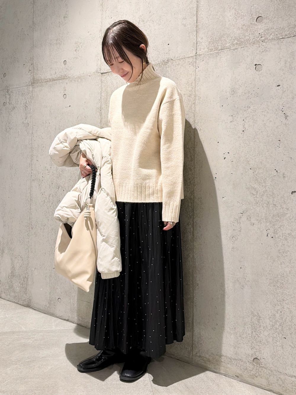 今回は、ドット柄のプリーツスカートと合わせた、キレイめコーディネートです。