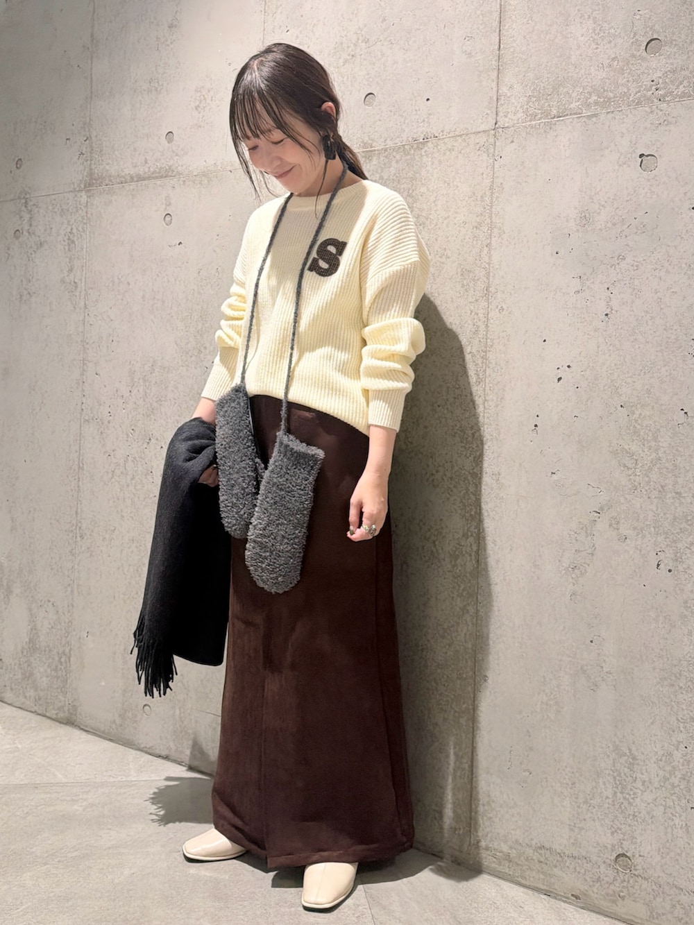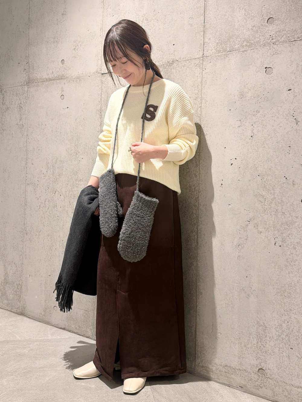 今回は、スエード調のロングスカートと合わせた、大人カジュアルコーディネート。
