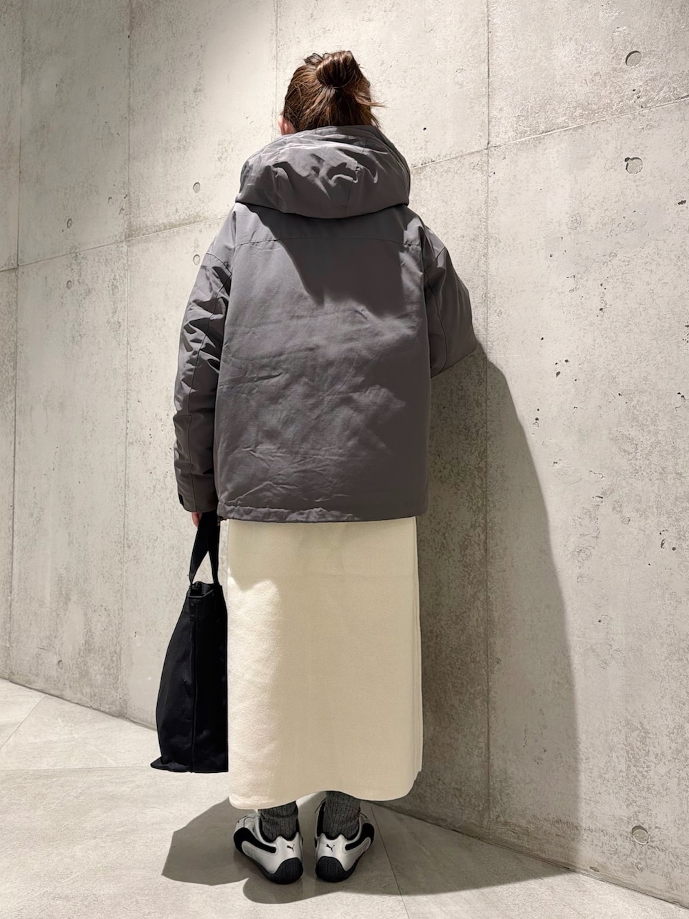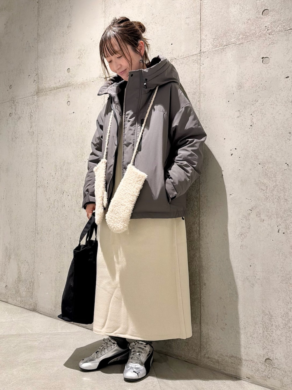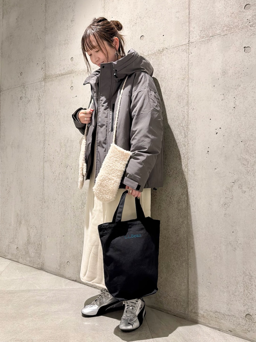 手袋を首にかけて、トレンド感をプラス。