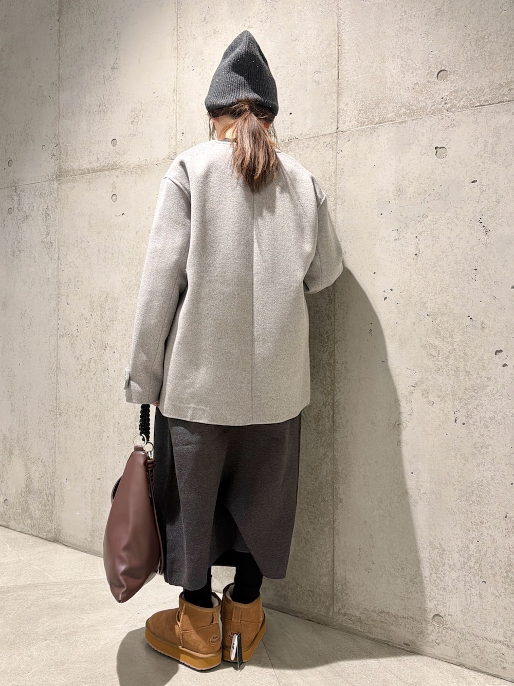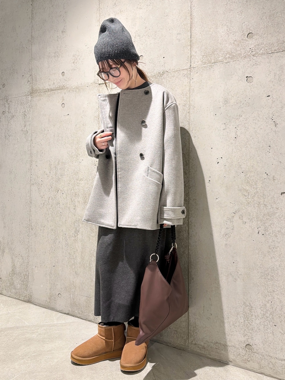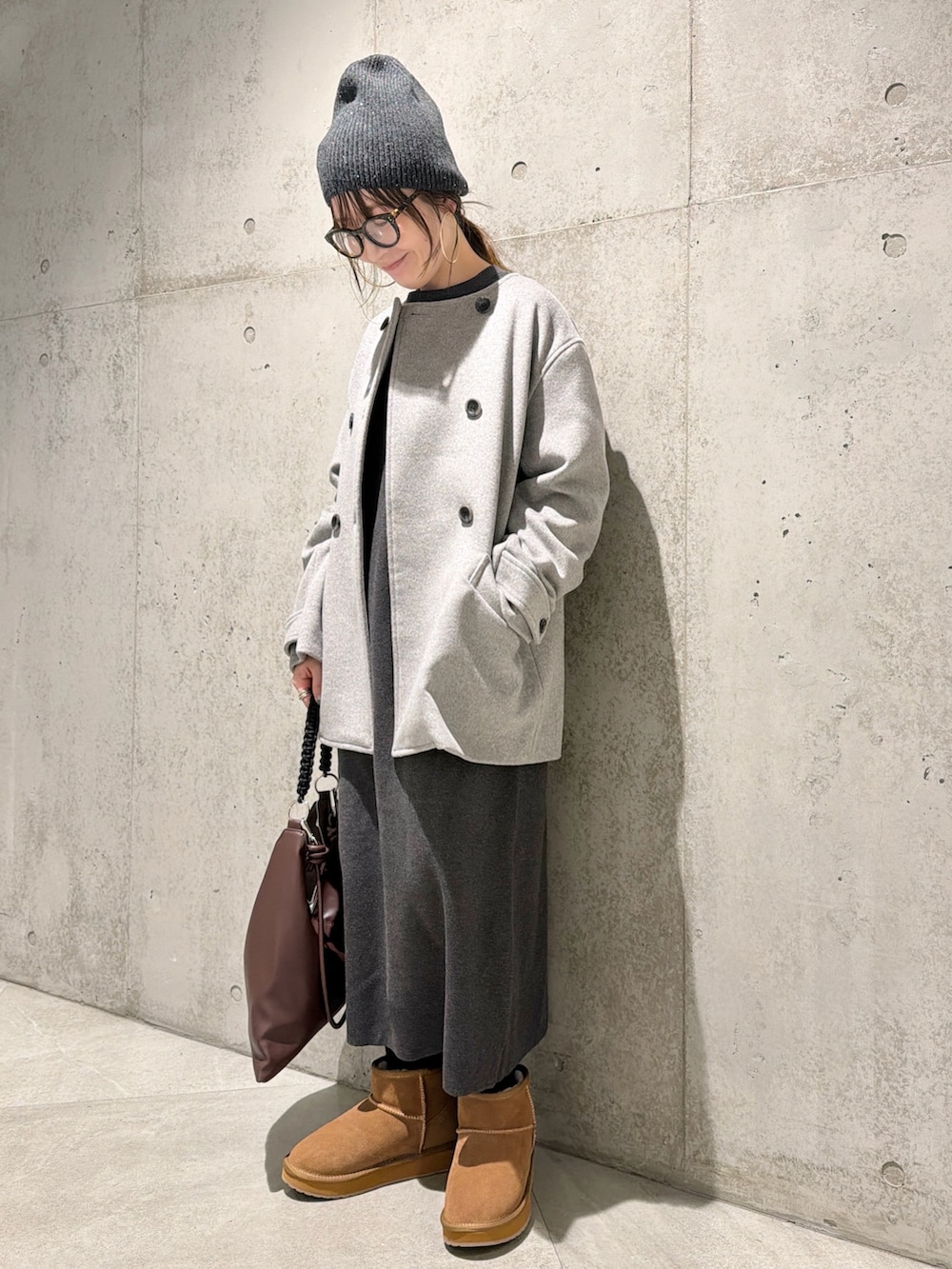 ニット帽や、ムートンブーツで暖かく、季節感のあるスタイルに。