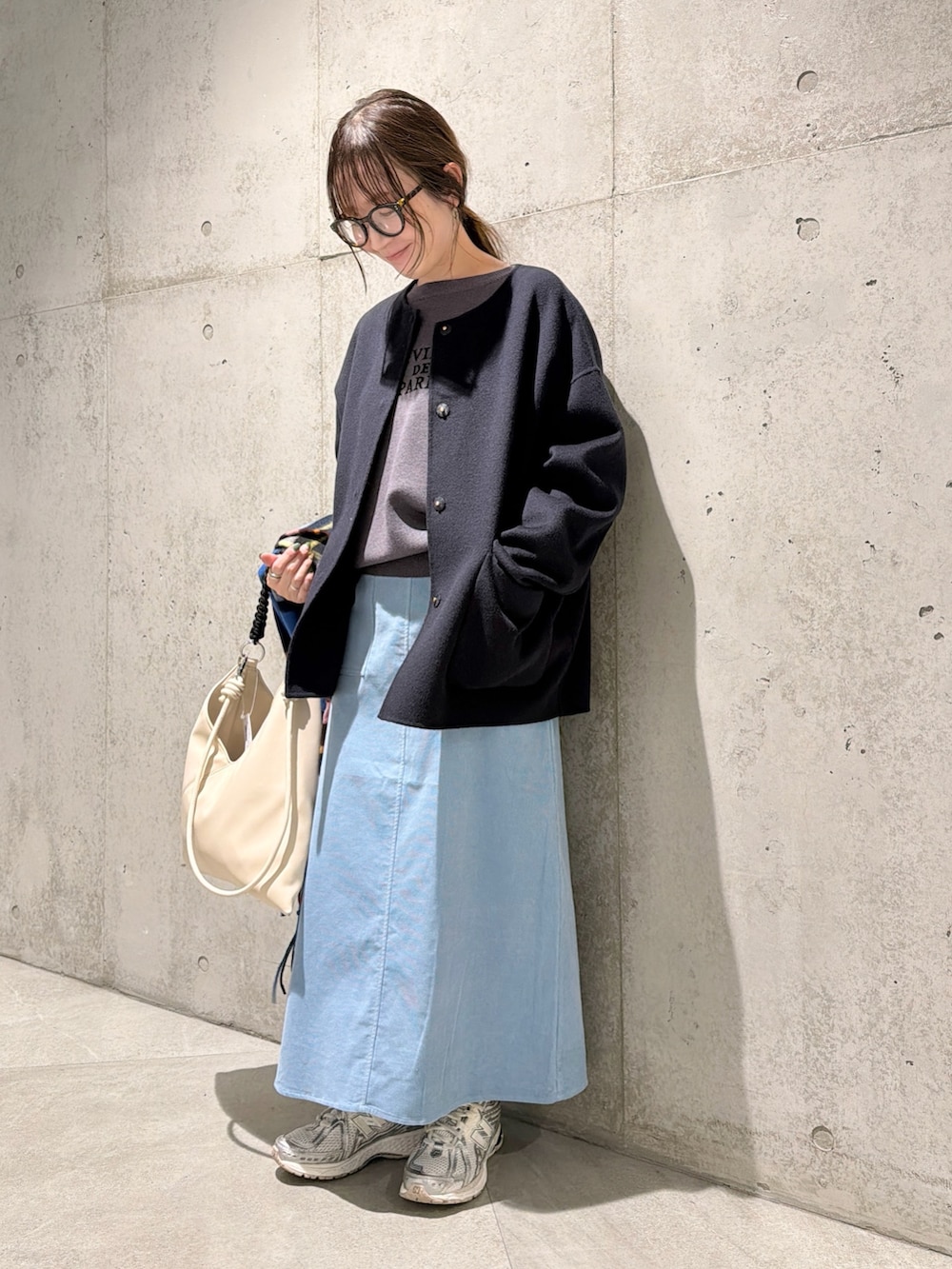 今回は、ブルーのコーデュロイスカートを合わせた、カジュアルコーディネートです。
