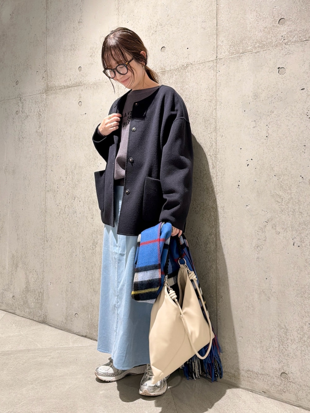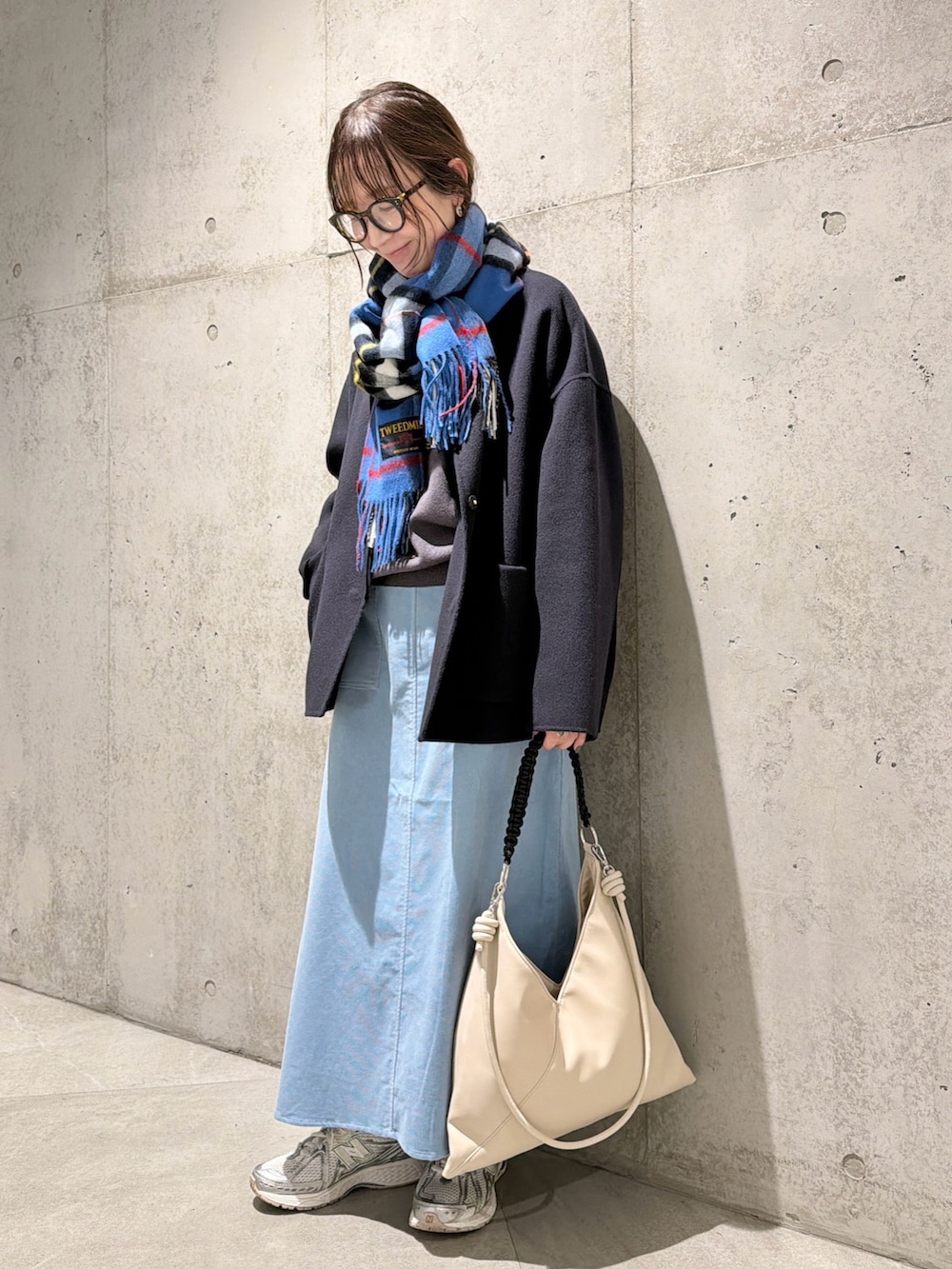 季節感のあるチェック柄のマフラーをアクセントに、ブルー系でまとめてみました。