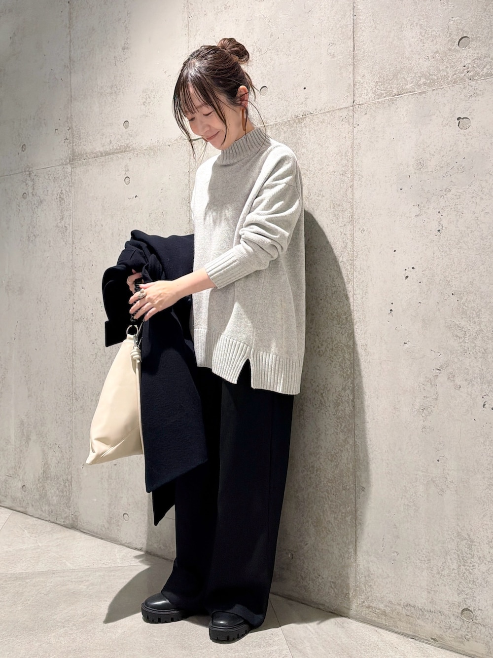 今回は、ゆったりとしたニットに、シンプルにブラックのパンツと合わせた、キレイめカジュアルコーディネート。