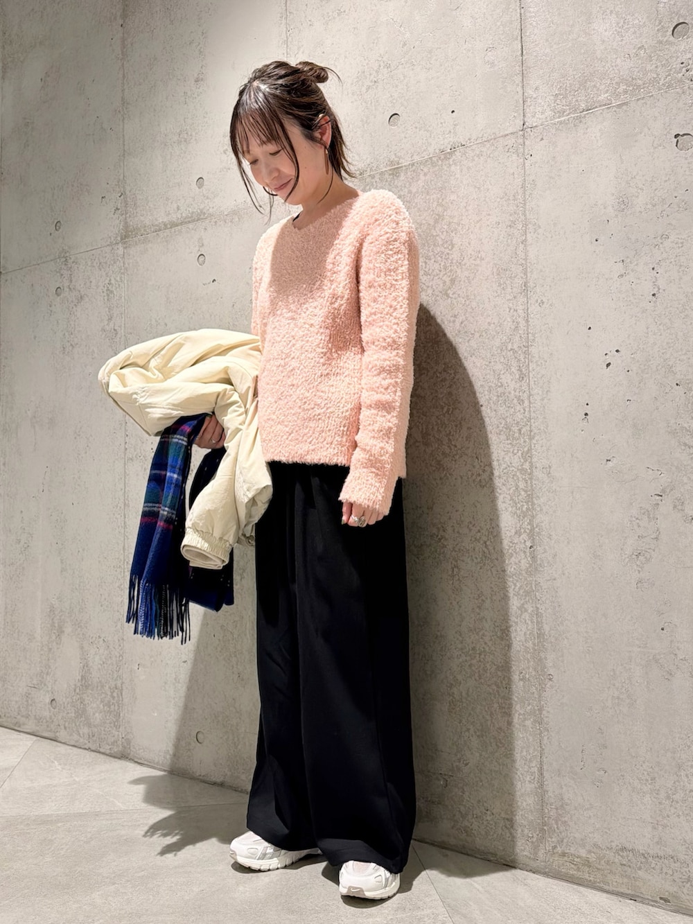 今回は、ピンクのニットと合わせて、フェミニンさをプラスしたキレイめカジュアルコーディネート。