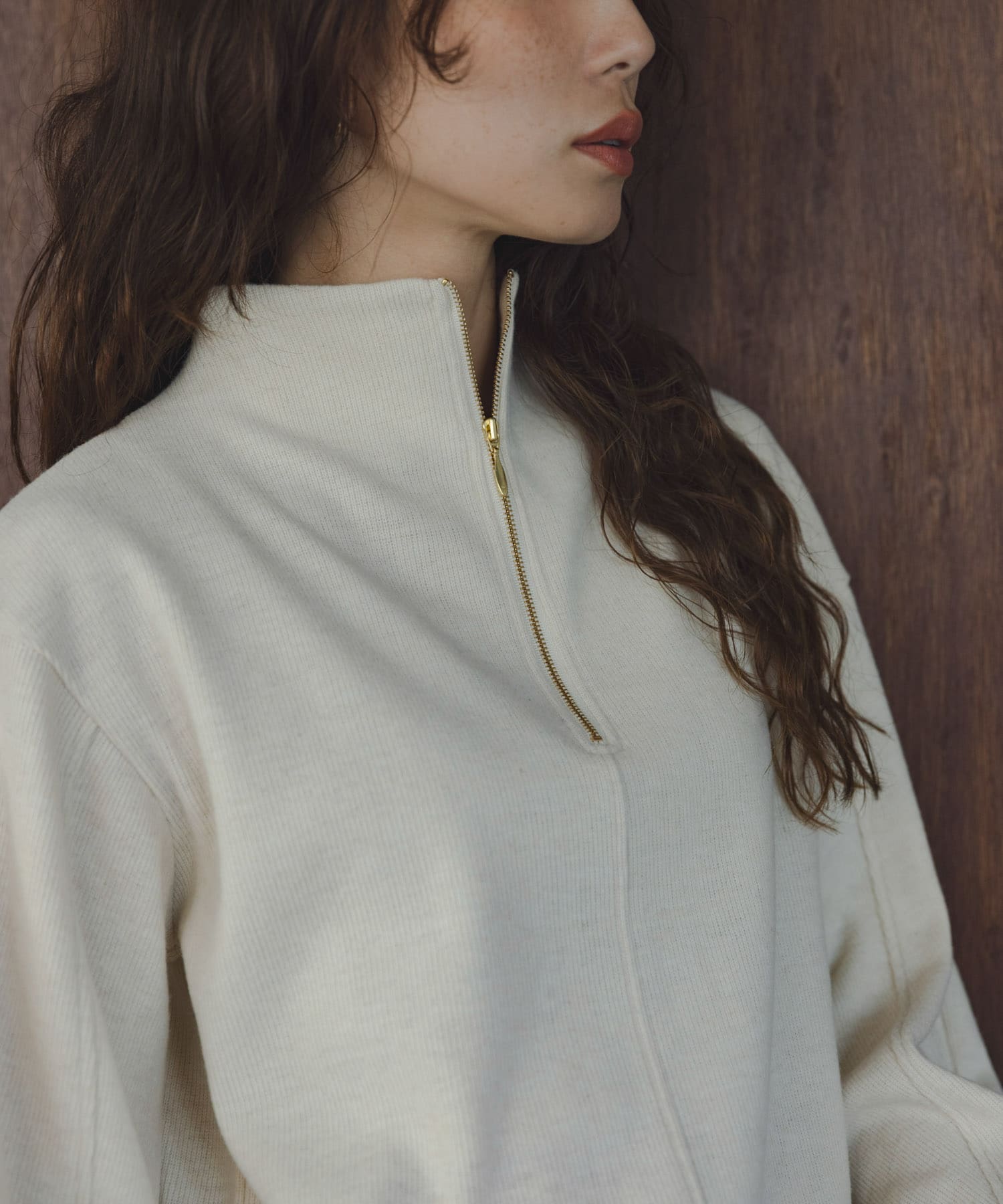 トップスは、ジップデザインを前後どちらにしても着ていただけるアイテムです。