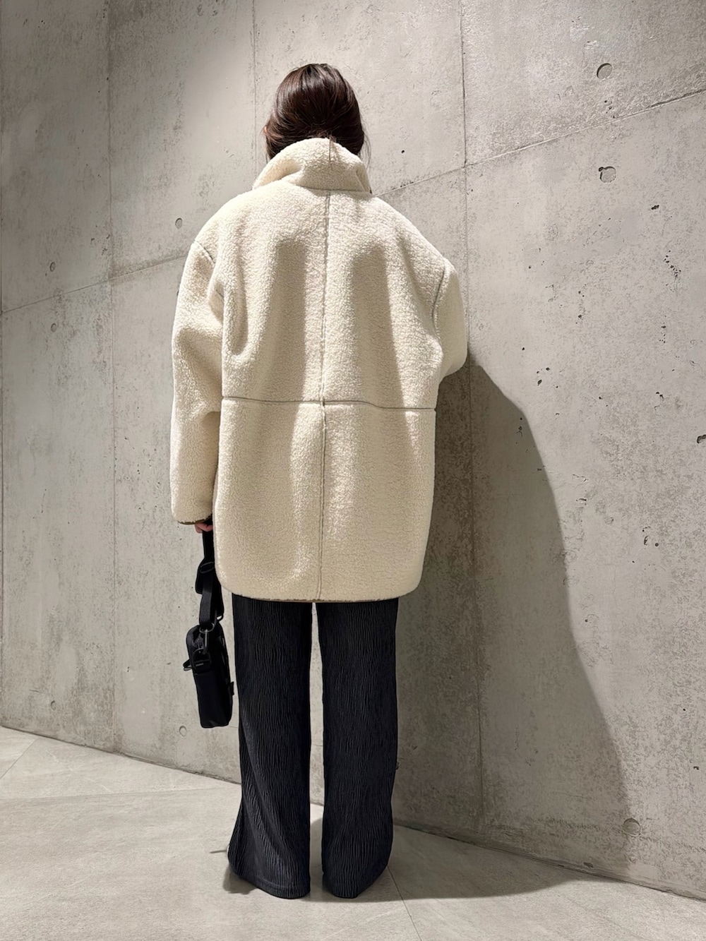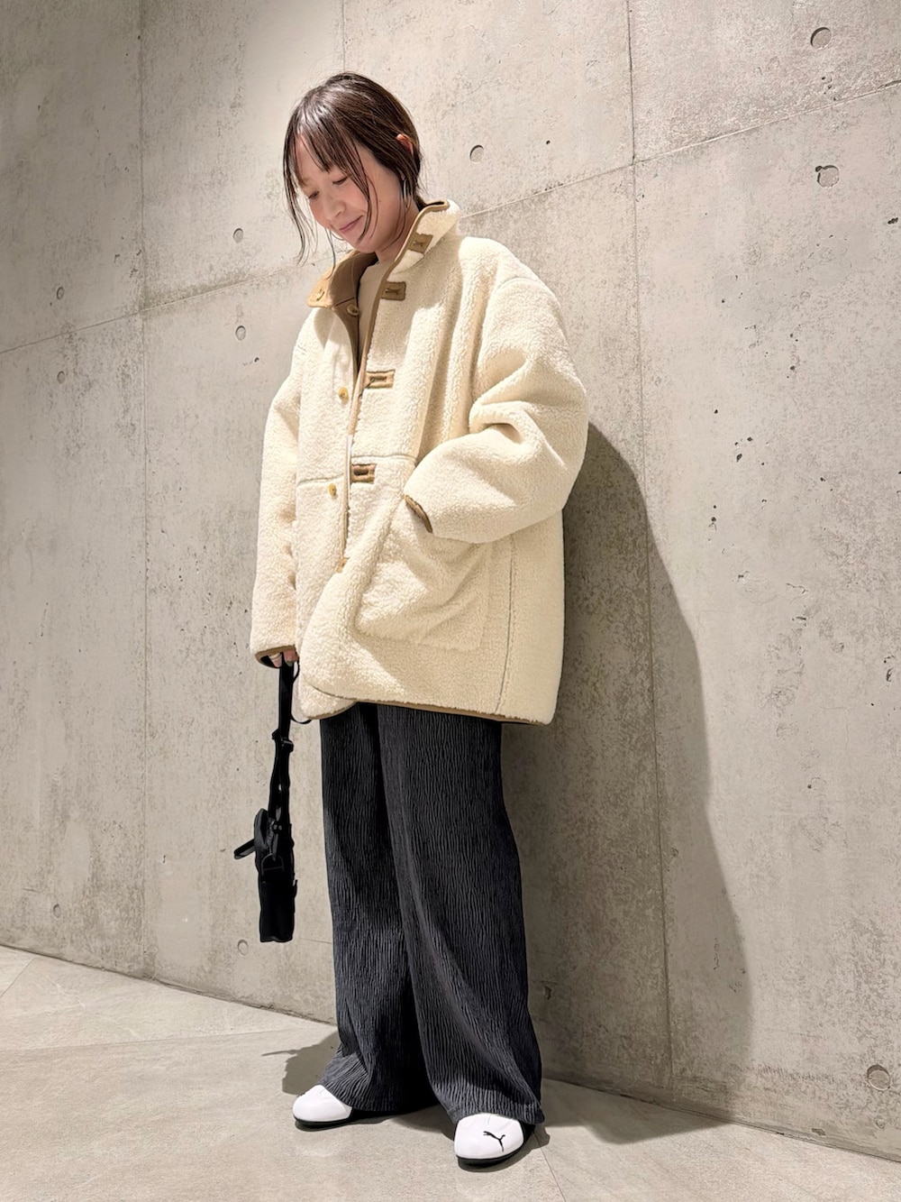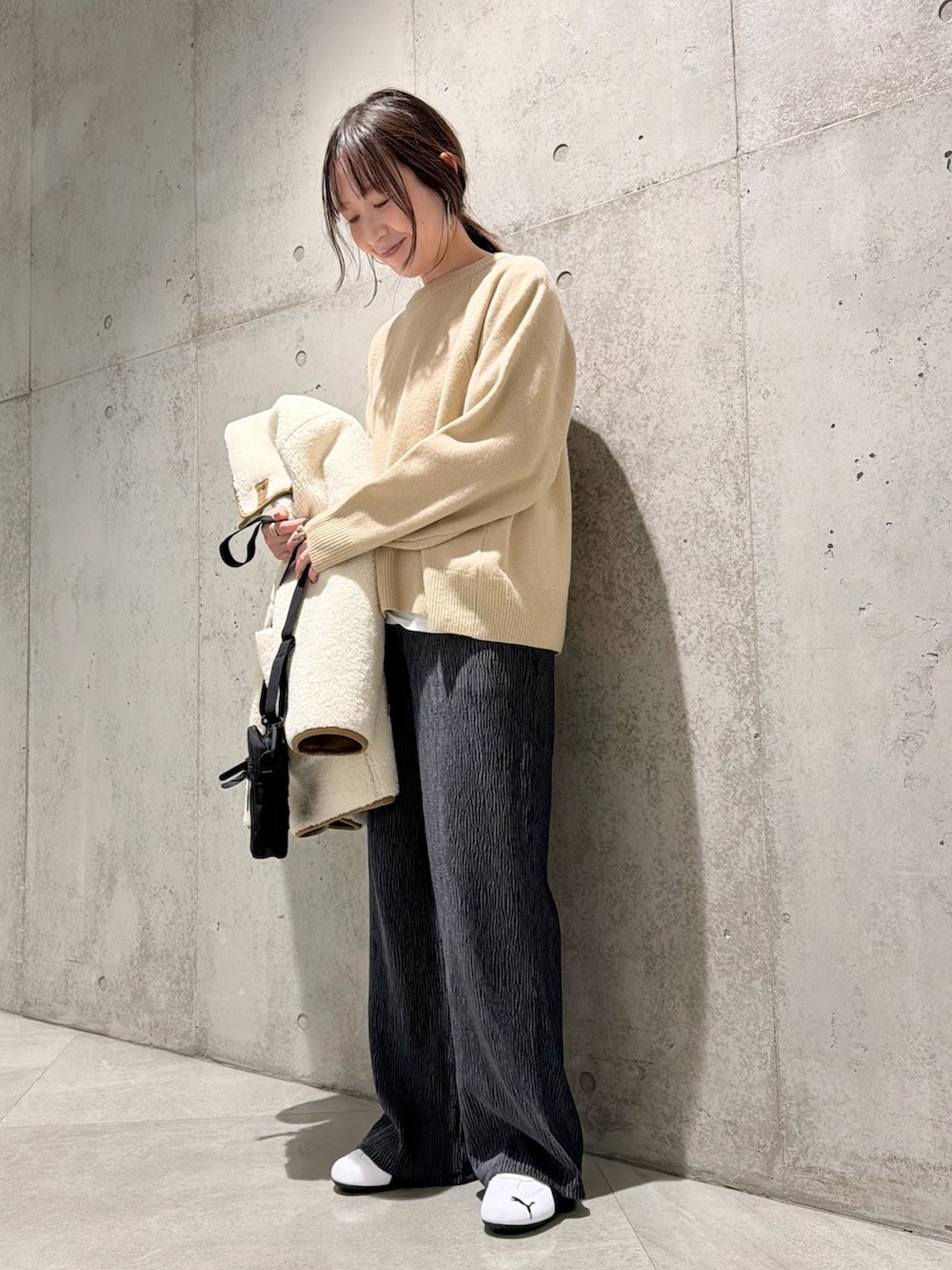今回は、細かいプリーツが印象的なイージーパンツと合わせた、大人カジュアルコーディネートです。
