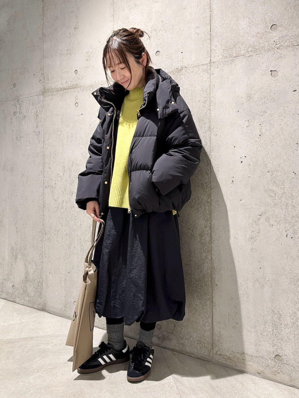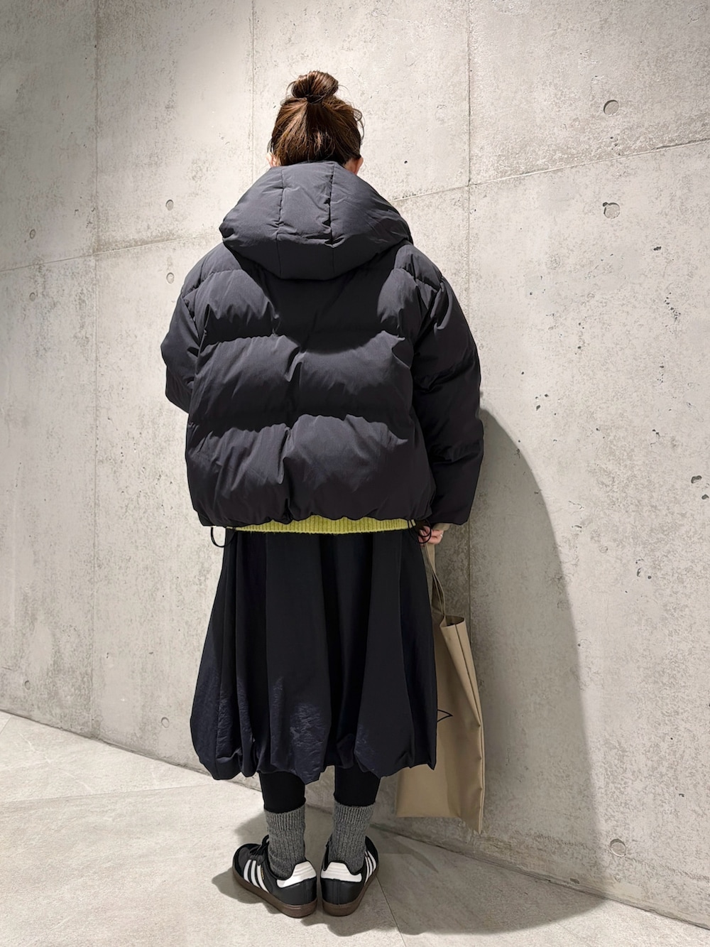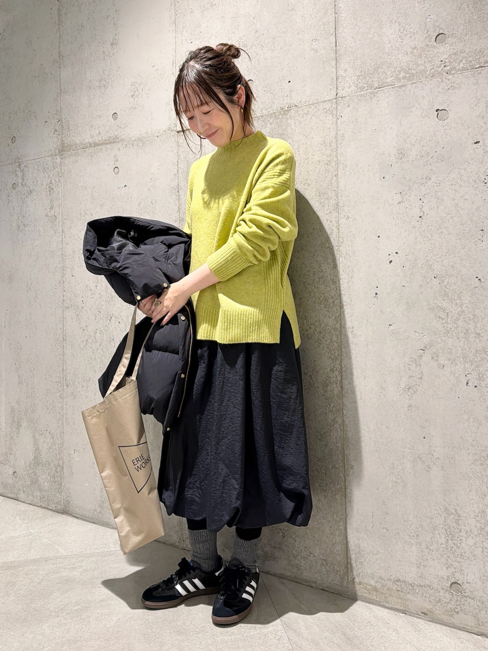 スカートは、ふんわりとしたバルーンシルエットがポイント。