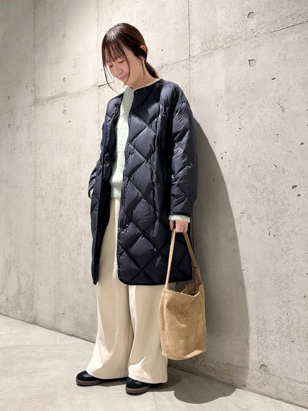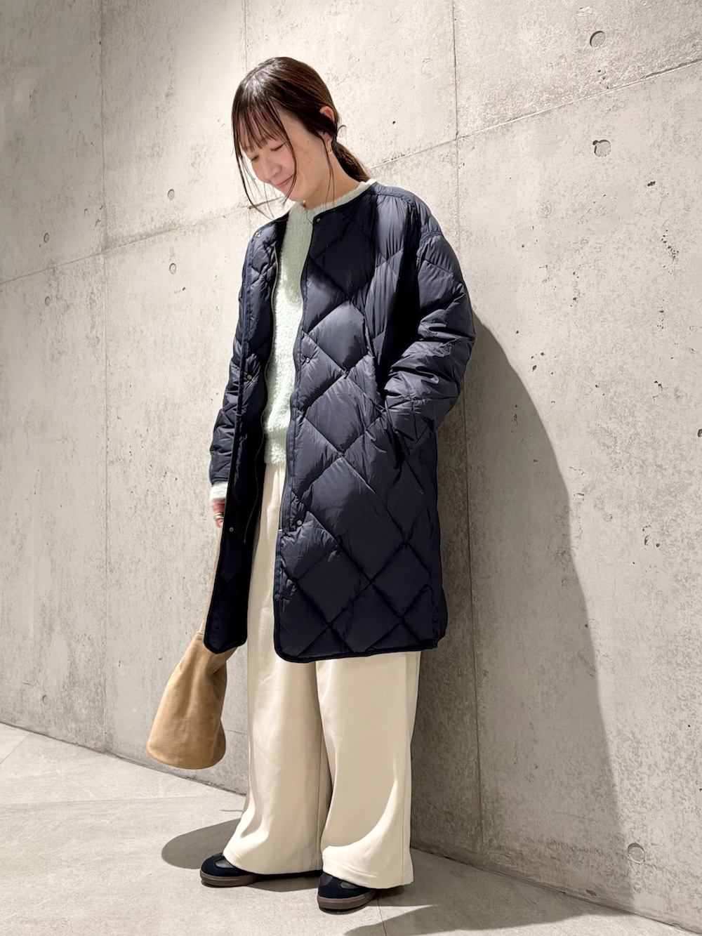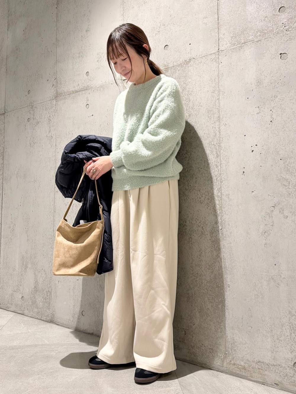 今回は、ミントカラーのニットをアクセントにしたコーディネートです。