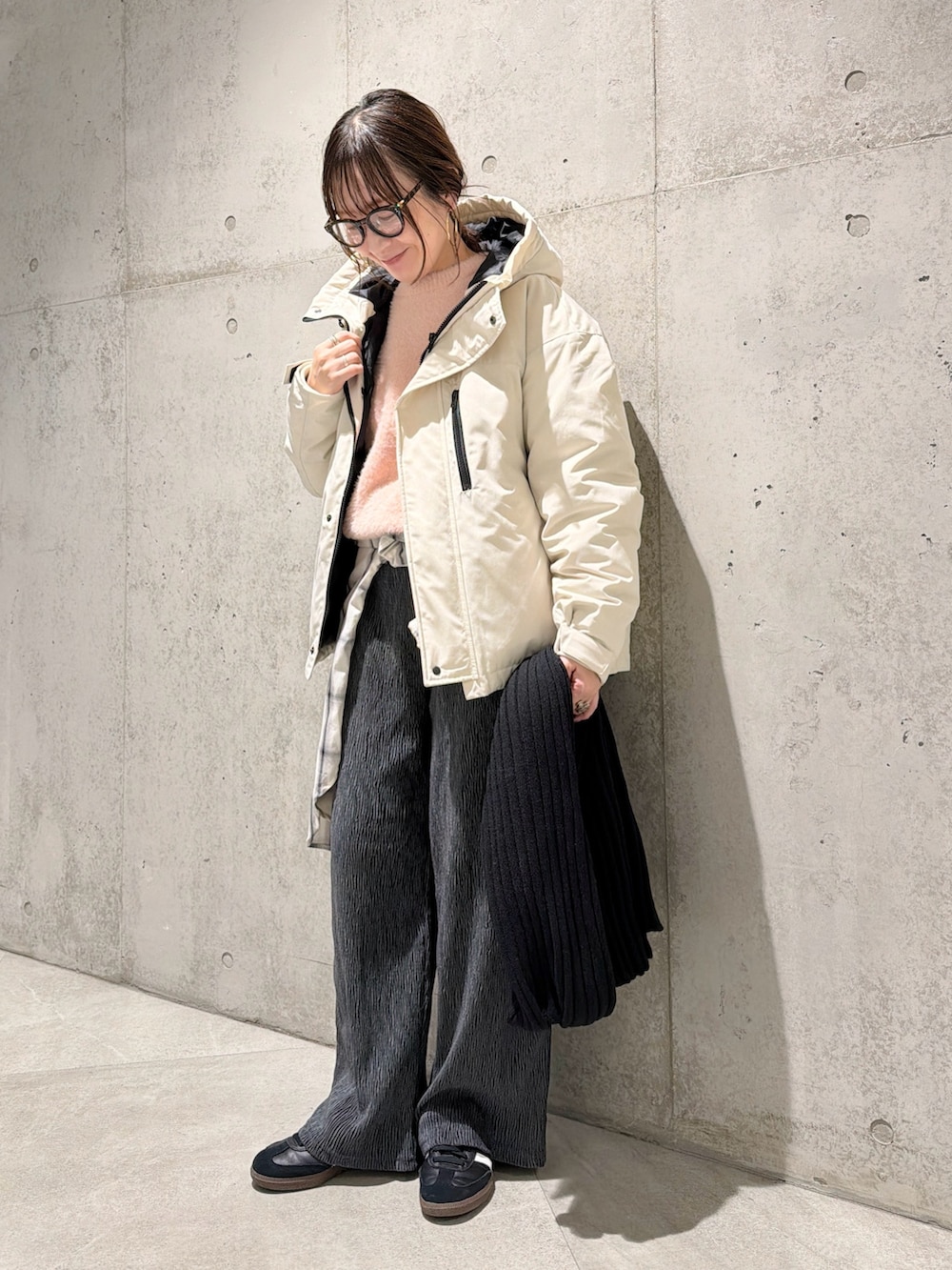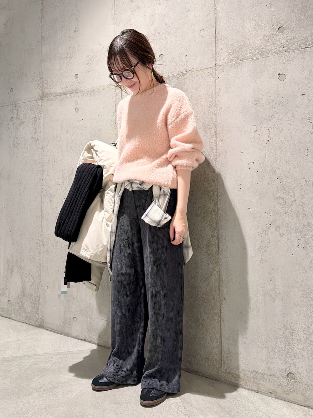 今回は、ふんわりと女性らしいピンクカラーのニットをアクセントにした、大人カジュアルコーディネートです。