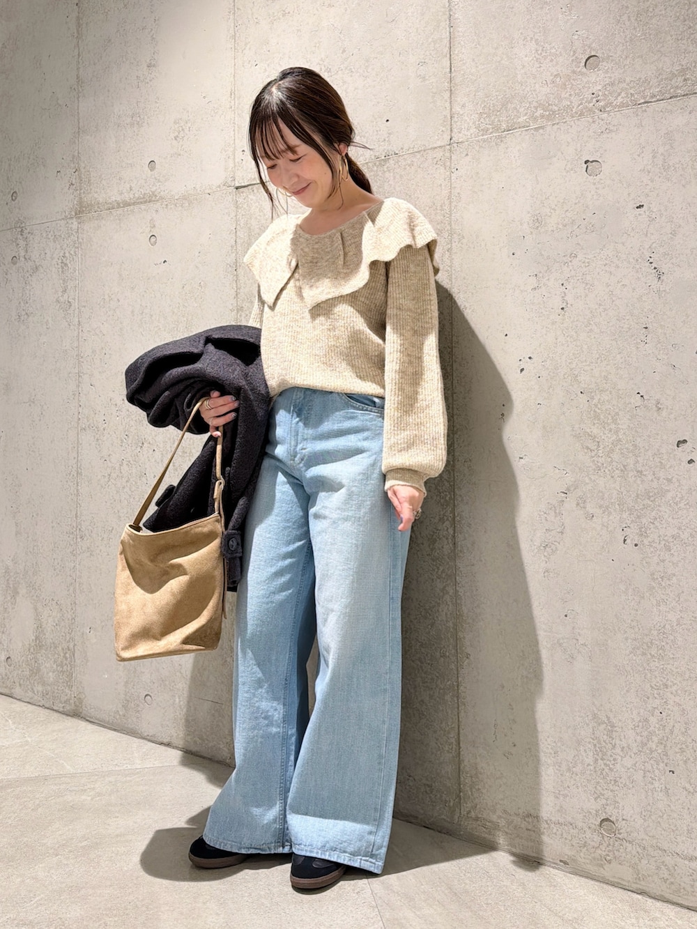 今回は、大きな襟が特徴的なニットとデニムを合わせた、大人カジュアルコーディネートです。