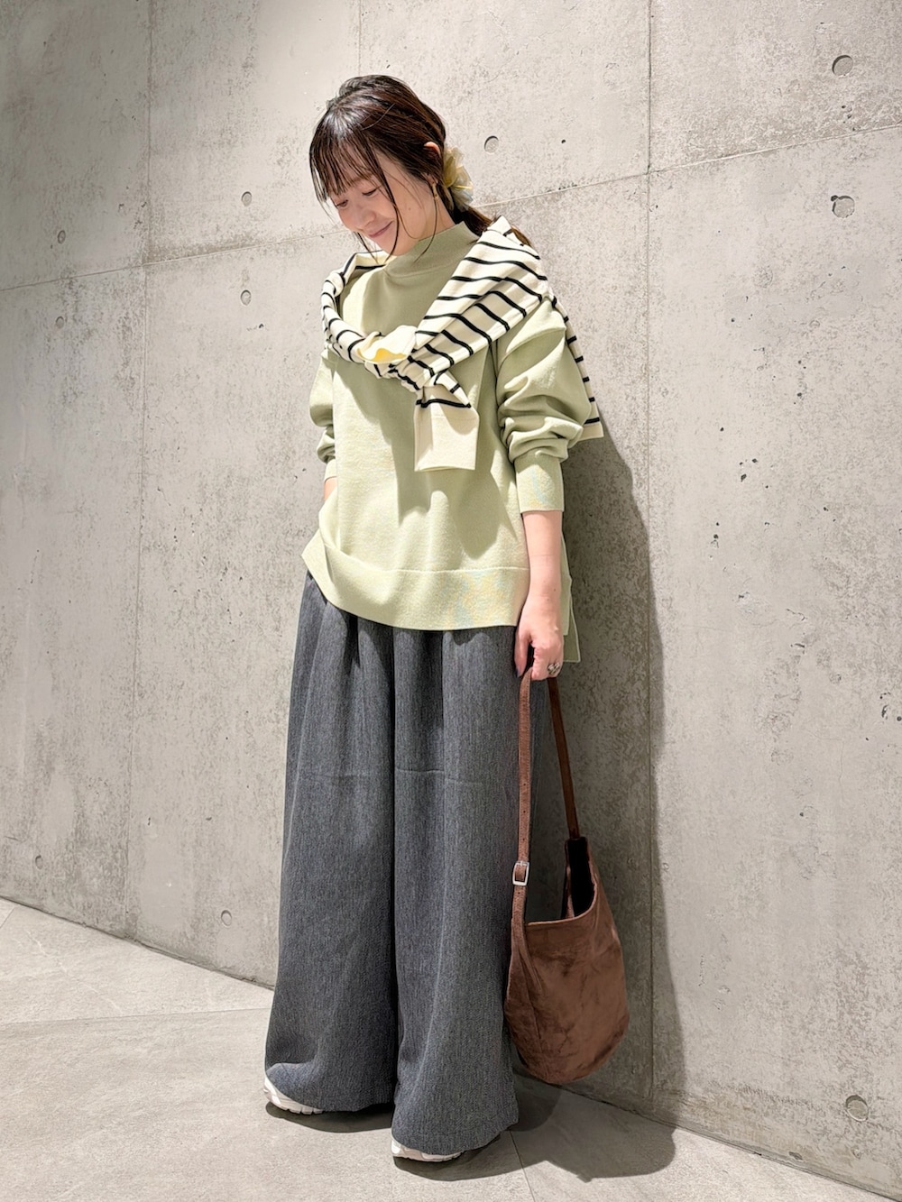 今回は、ワイドパンツと合わせて、春を意識したカラーでまとめてみました。