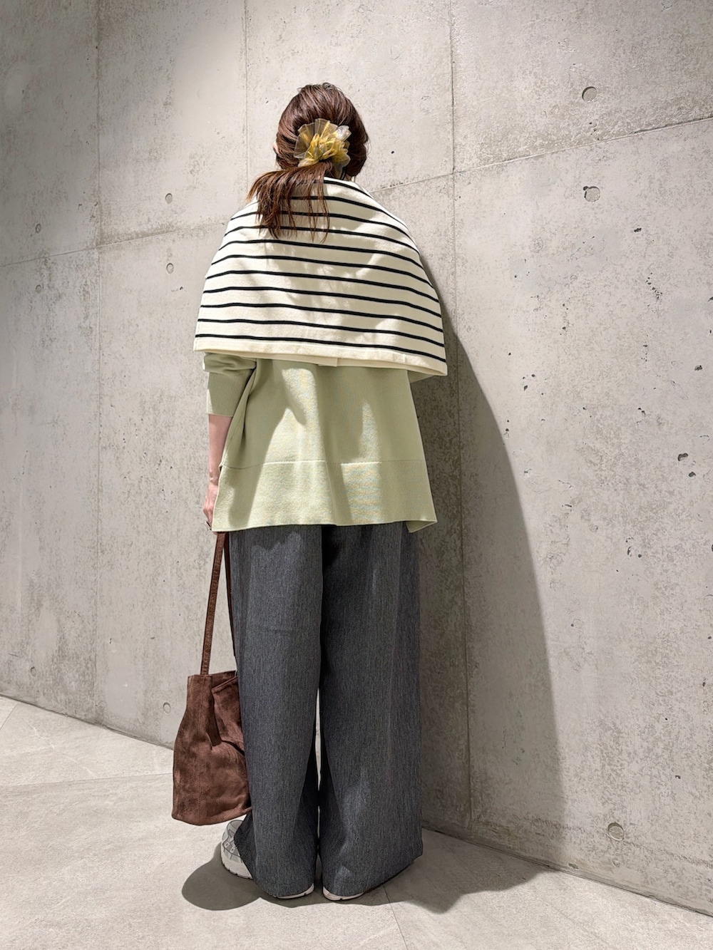 ボーダー柄のカーディガンを肩掛けしてアクセントに。