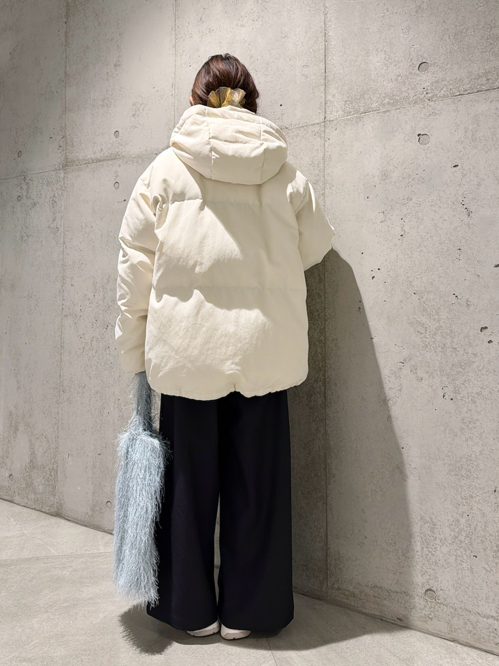 フードは取り外し可能で、カジュアルな表情からすっきりとしたスタンドカラーへと印象を変えて着ていただけます。