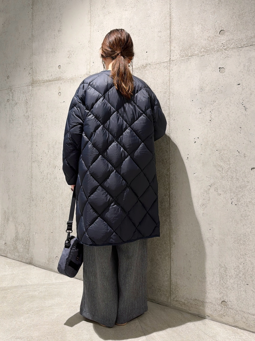 ノーカラーデザインなので、タートルネックやフード付きトップスともレイヤードしやすく、マフラーなどの小物でアレンジしていただけます。