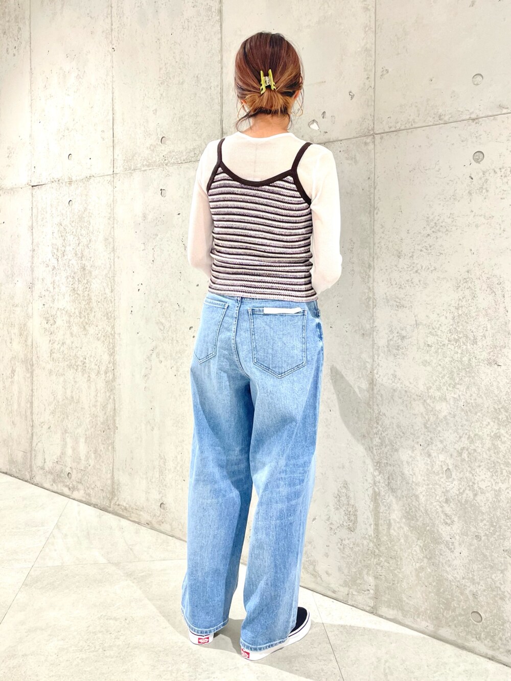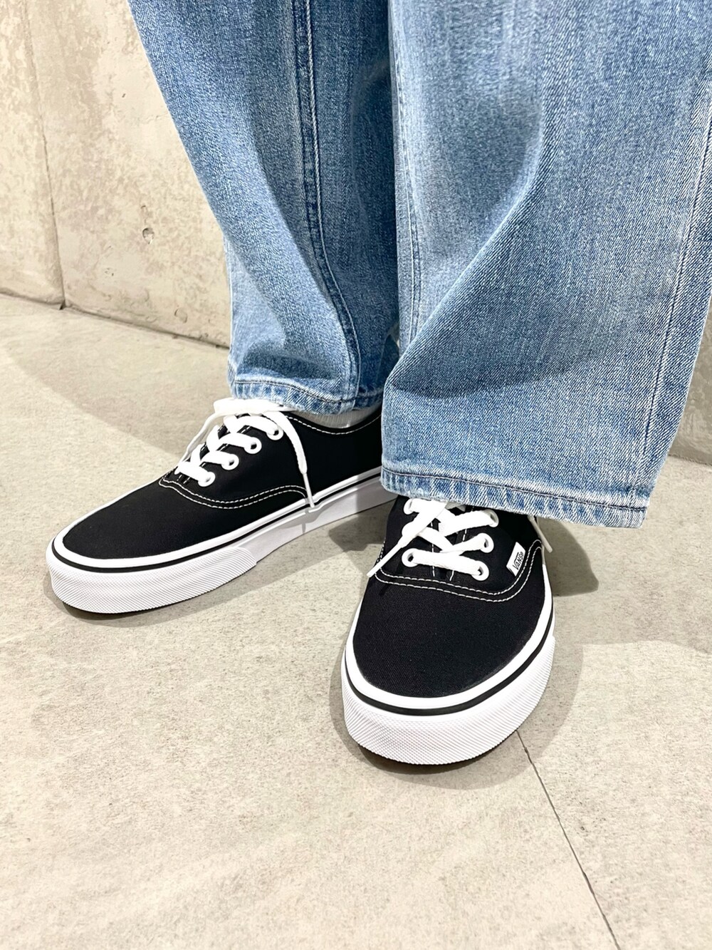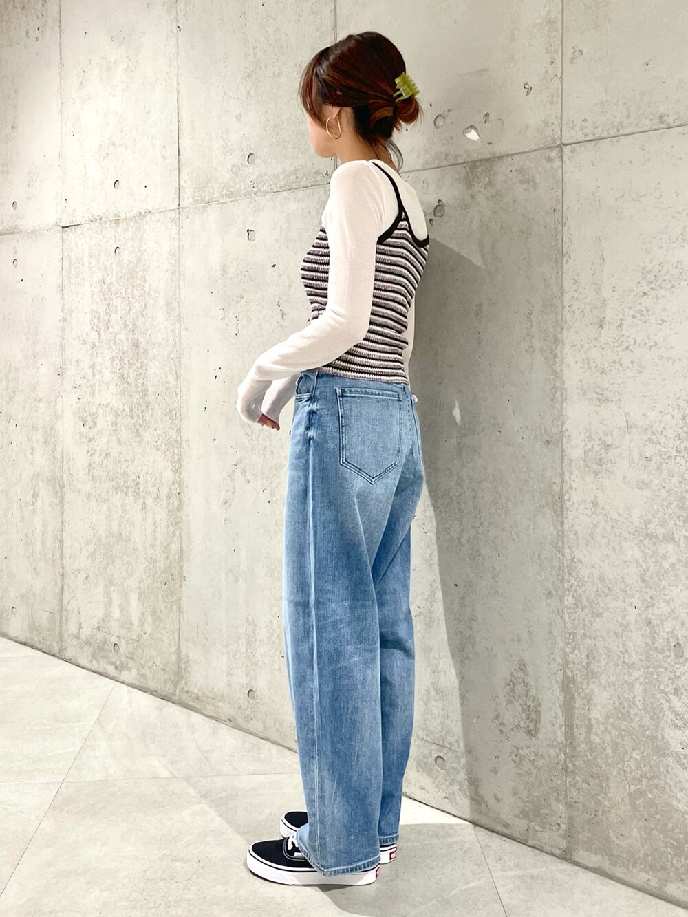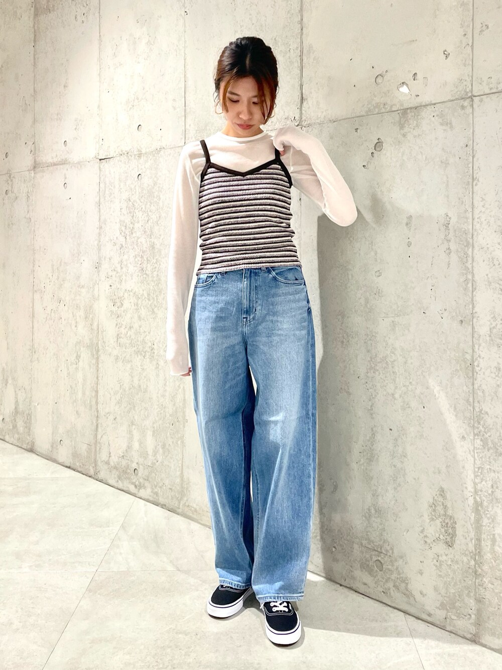 太めなデニムとローテクスニーカーで程よく垢抜けた印象に。