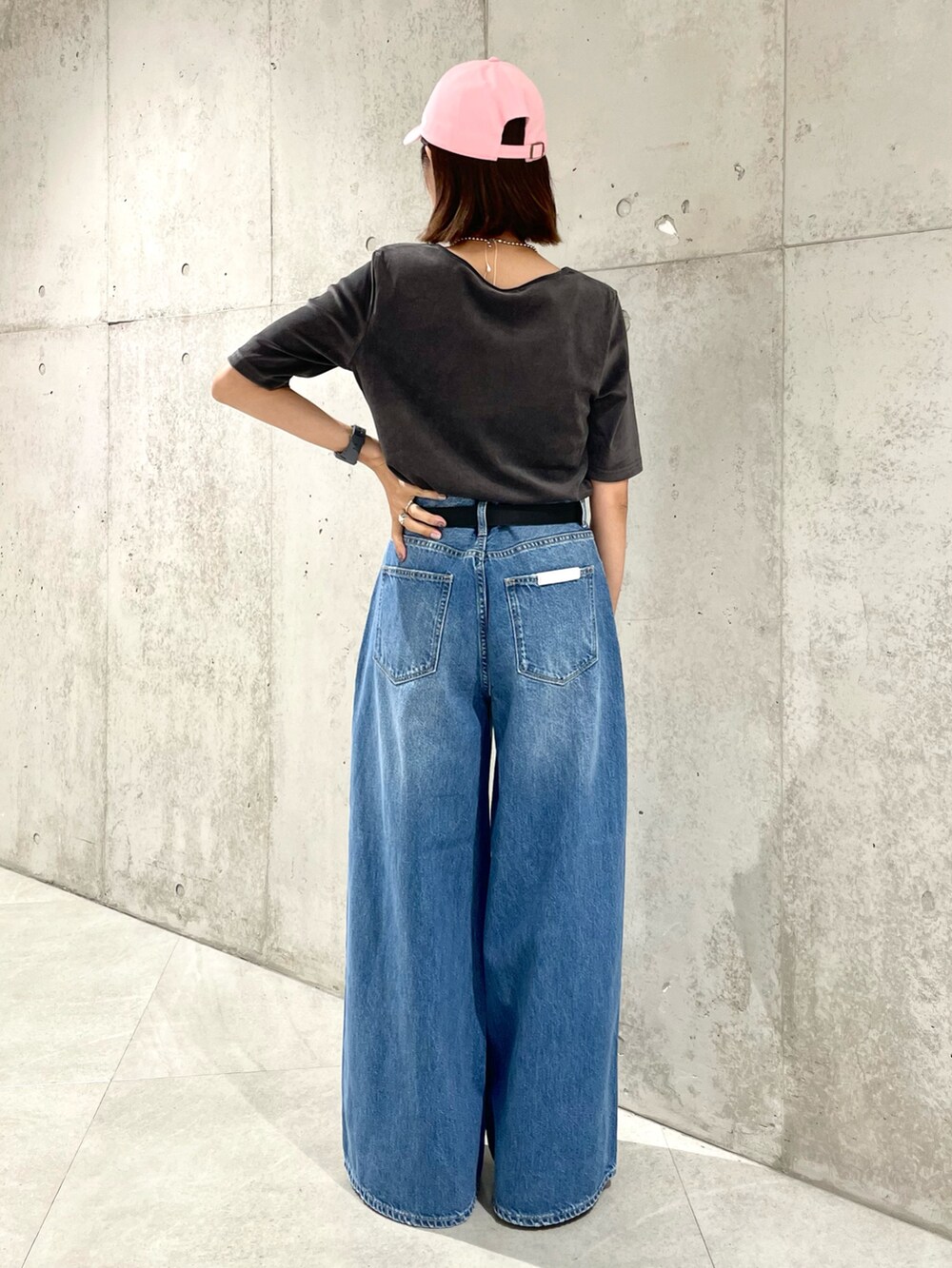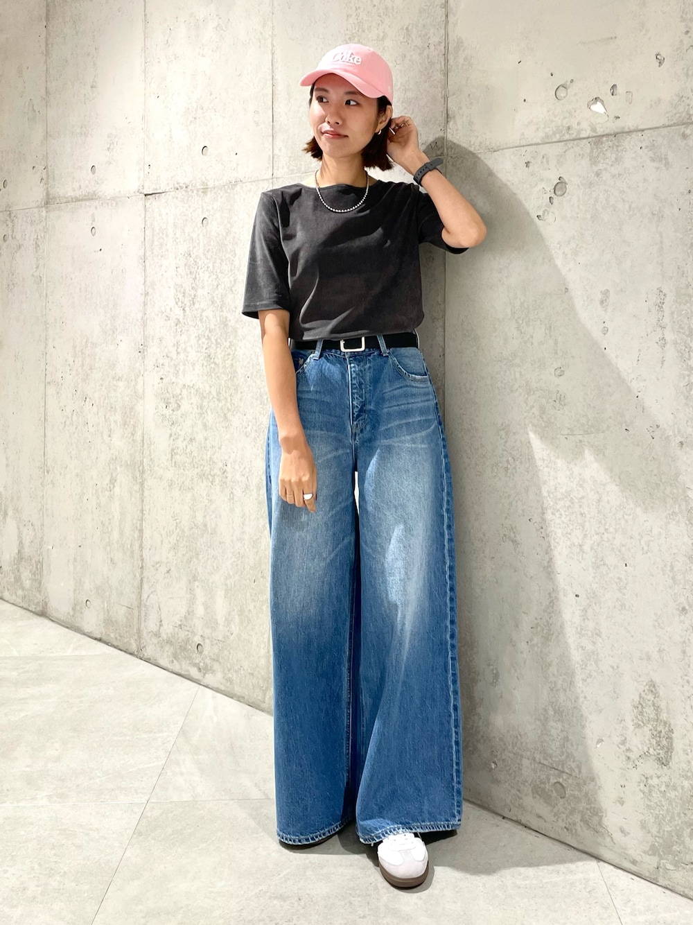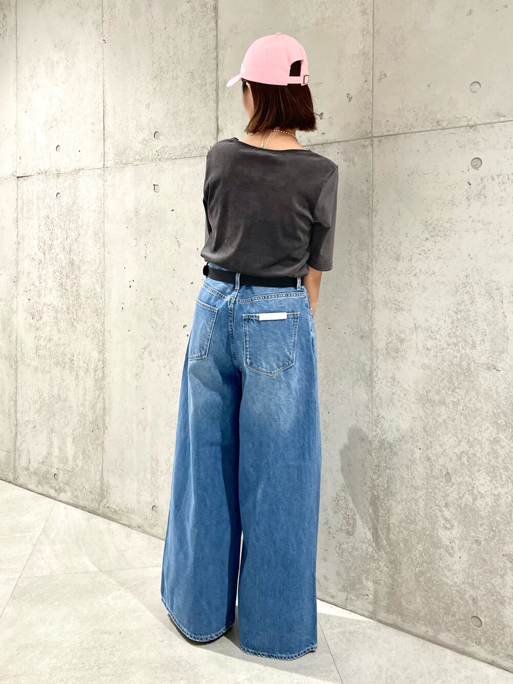 デニムは36がジャストサイズですが、在庫欠けの為38を着用してベルトできゅっとウエストを絞っています。