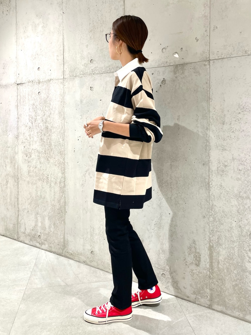 大きめサイズのものを着るときは、髪をアップにしたりコンパクトにまとめると垢抜けます!