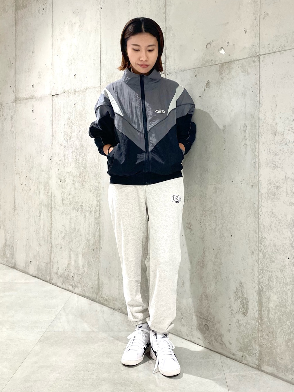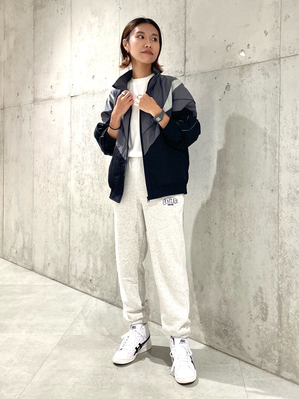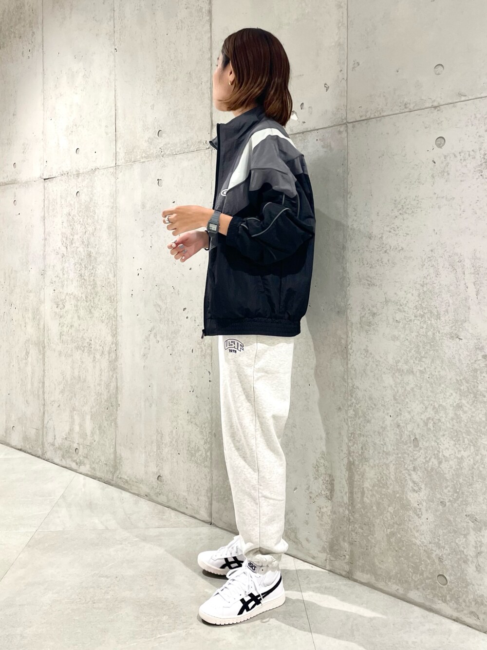 今回はGEMのナイロンジャケット×スウェットパンツに、asicsのハイカットスニーカーを合わせたスポーティースタイルです。