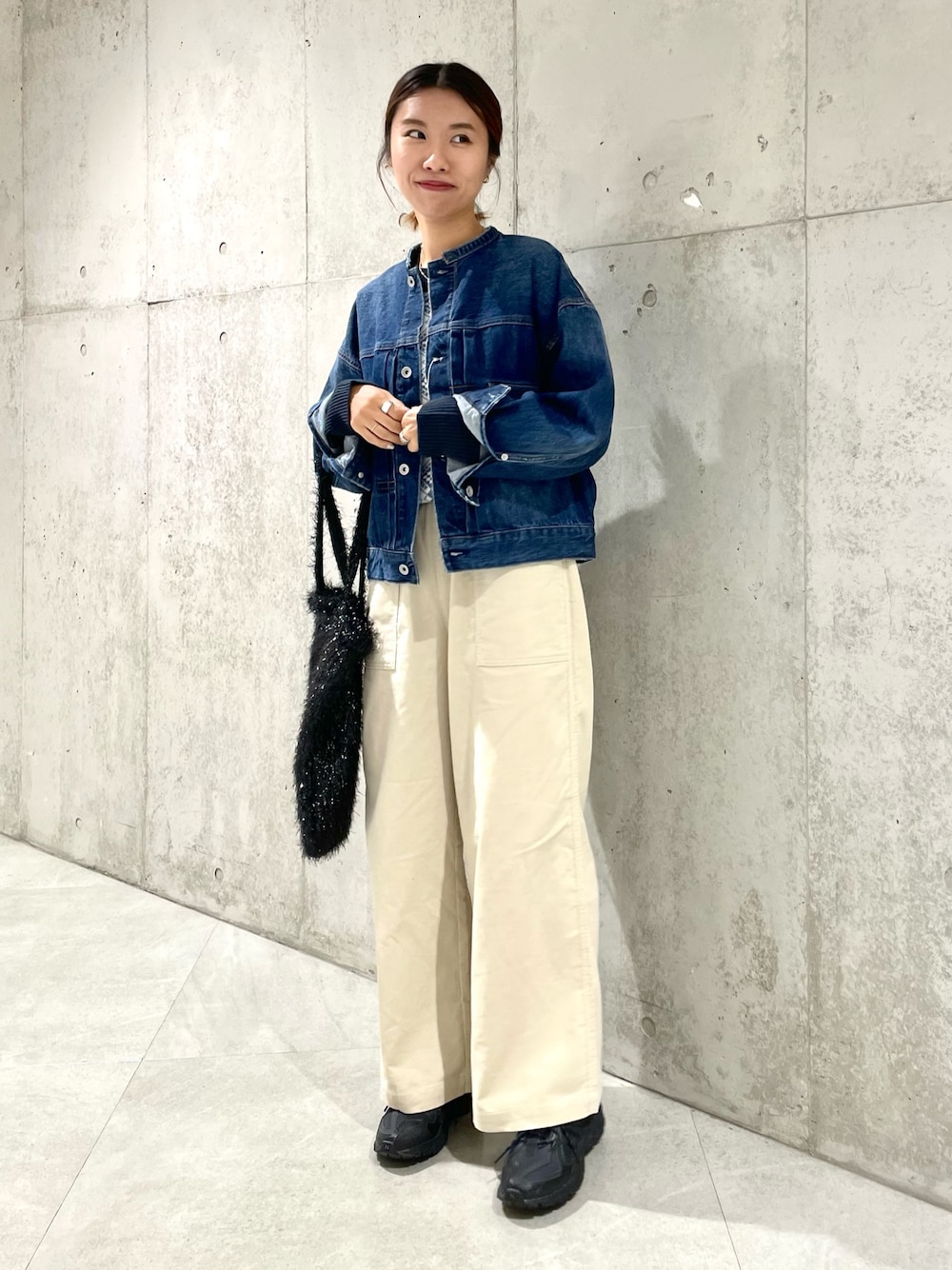 ノーカラーデニムジャケットは、朝晩冷えてきた今の時期にぴったり。