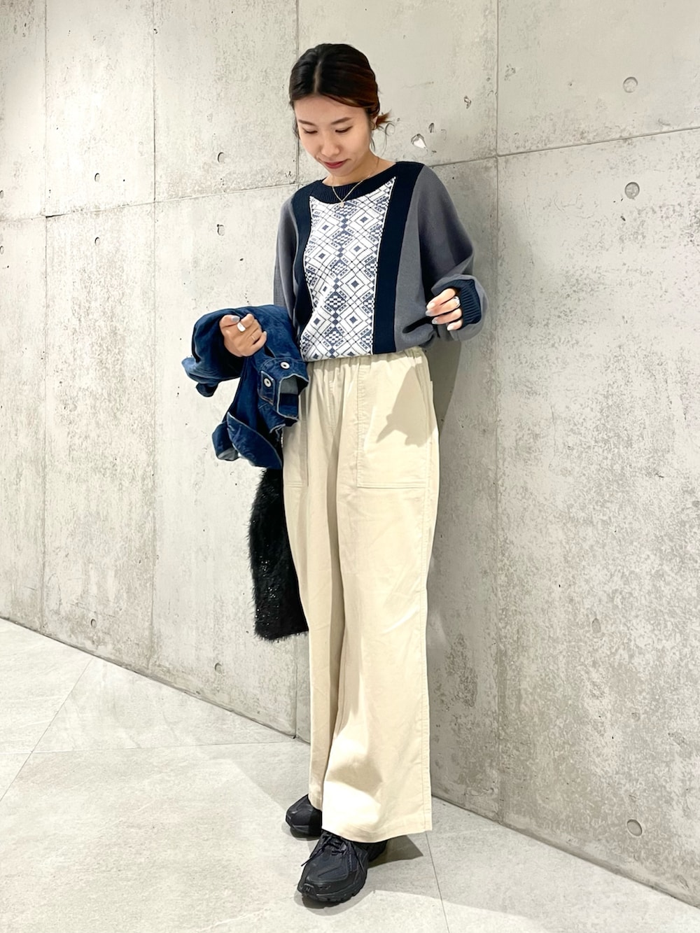 今回は柄編みが印象的なニットとコーデュロイパンツを合わせました。