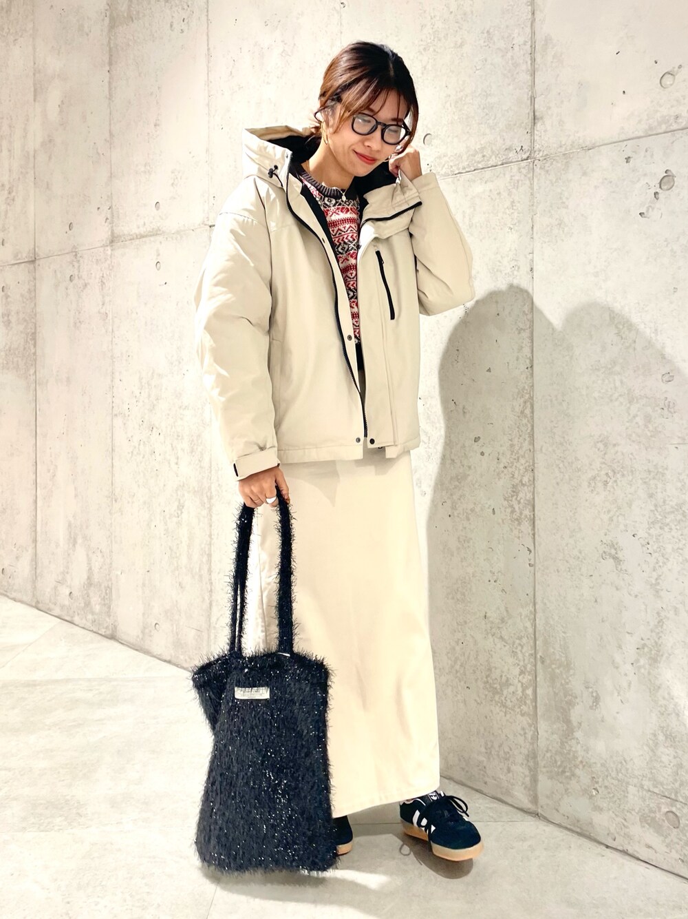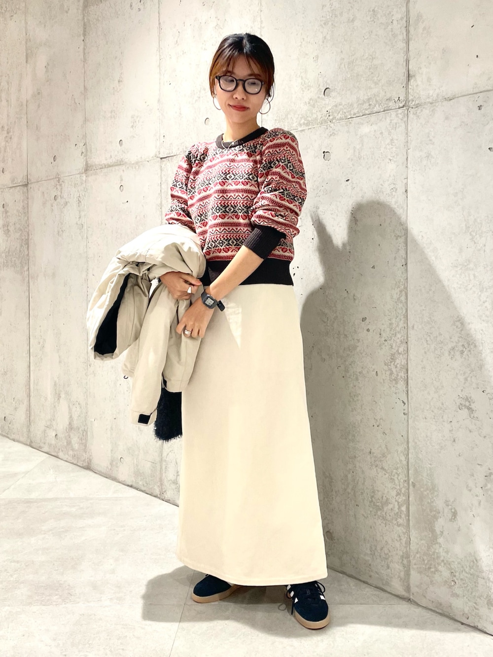 合わせたコーデュロイナロースカートは、38着用でぴったりロング丈。