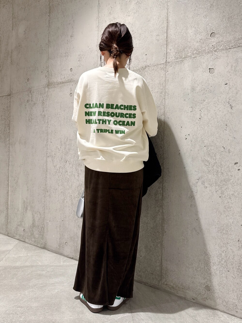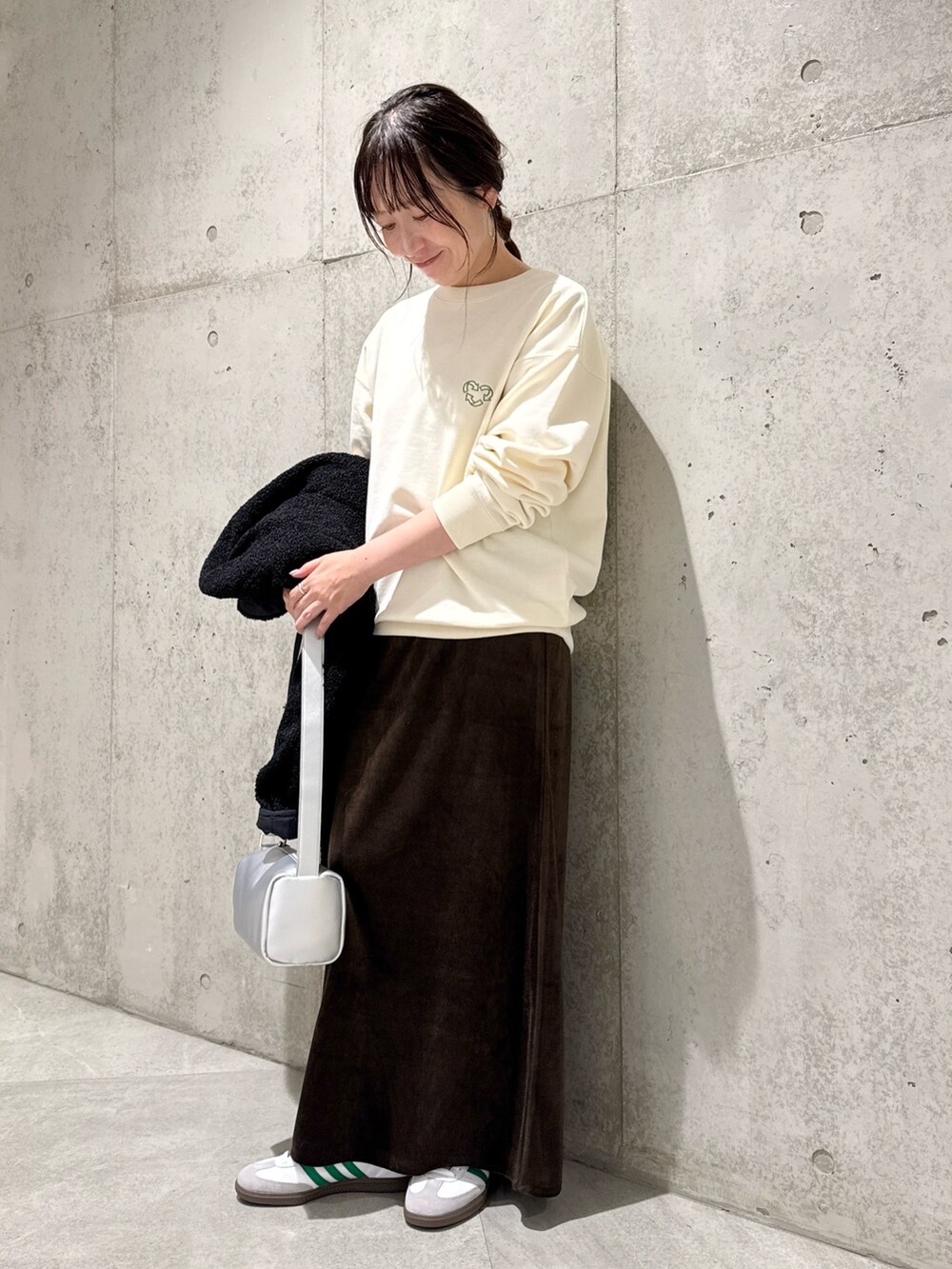 今回は、スウェットに、ベロアのスカートを合わせた大人カジュアルコーディネート。