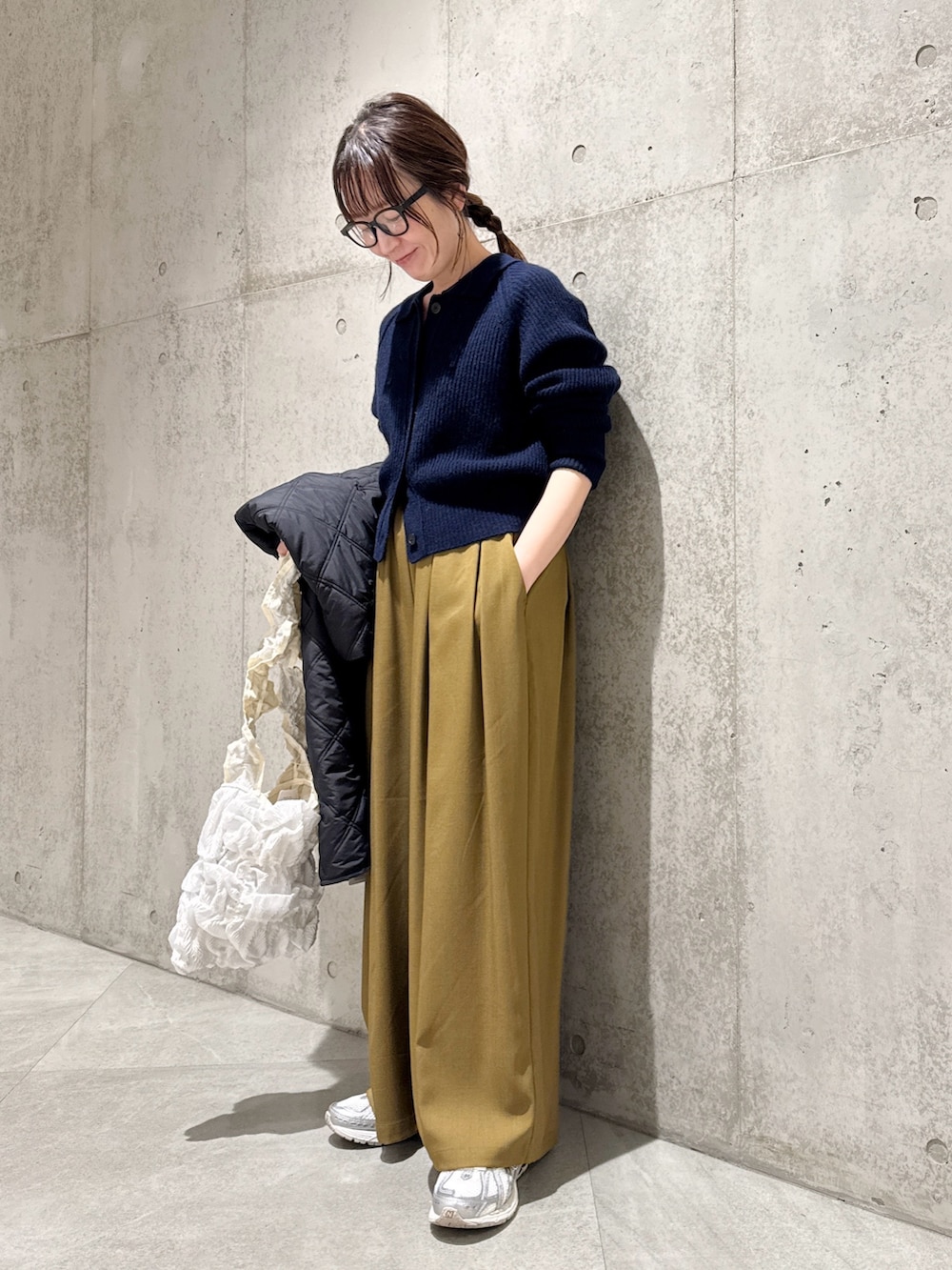 今回は、コンパクトなニットカーディガンに、ワイドパンツを合わせて、ゆるピタコーディネートにしてみました。