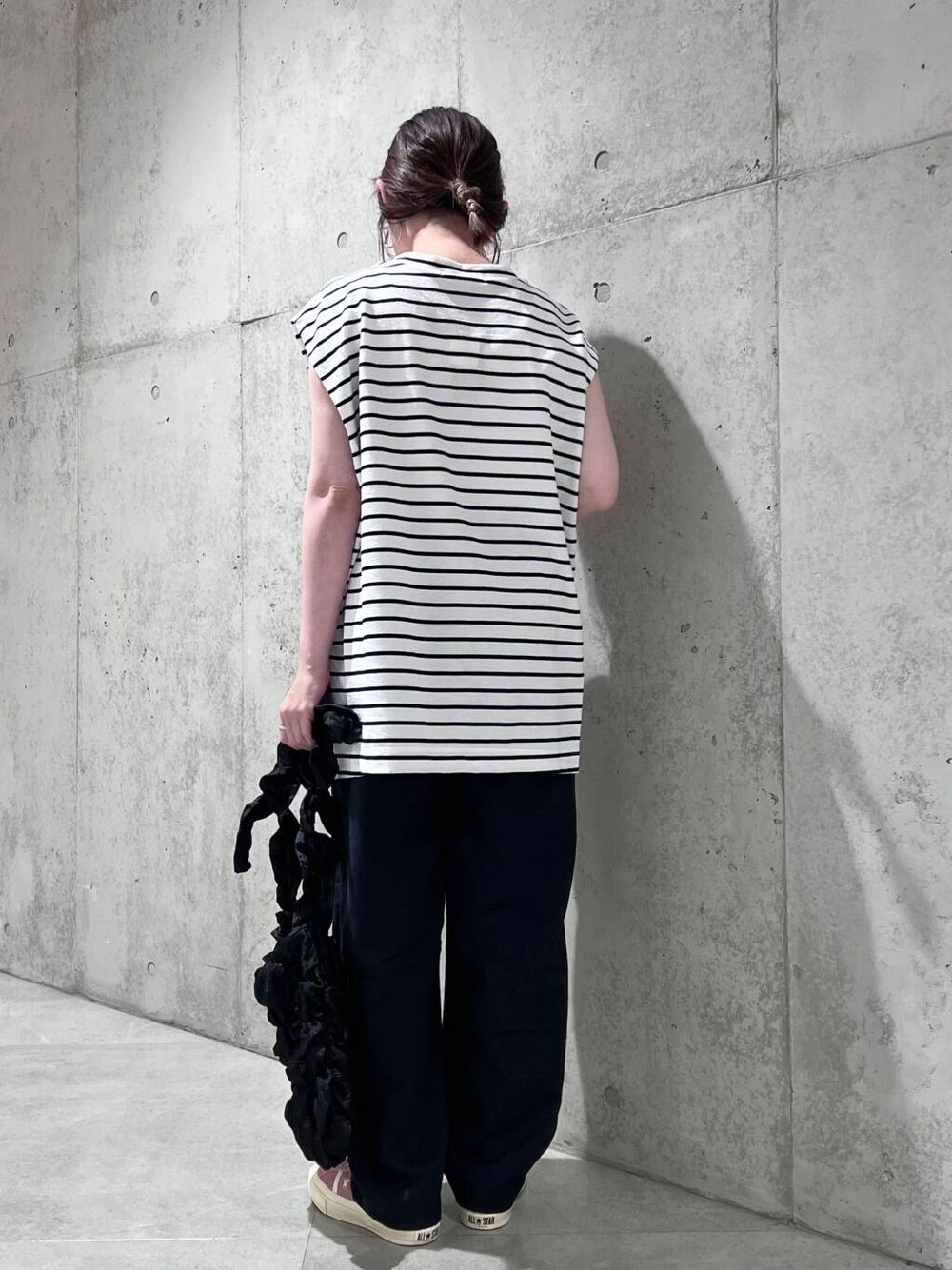 今回は、ギャザーがたっぷりと入ったカーブパンツを合わせてみました。