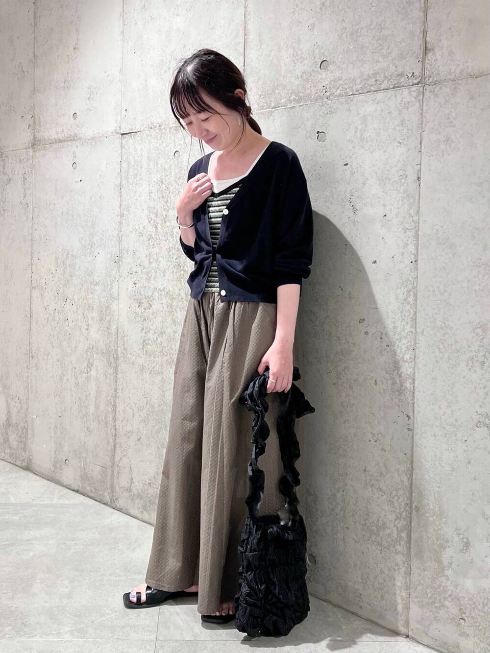 インナーは、ボーダー柄のニットキャミで、秋先取り感を。