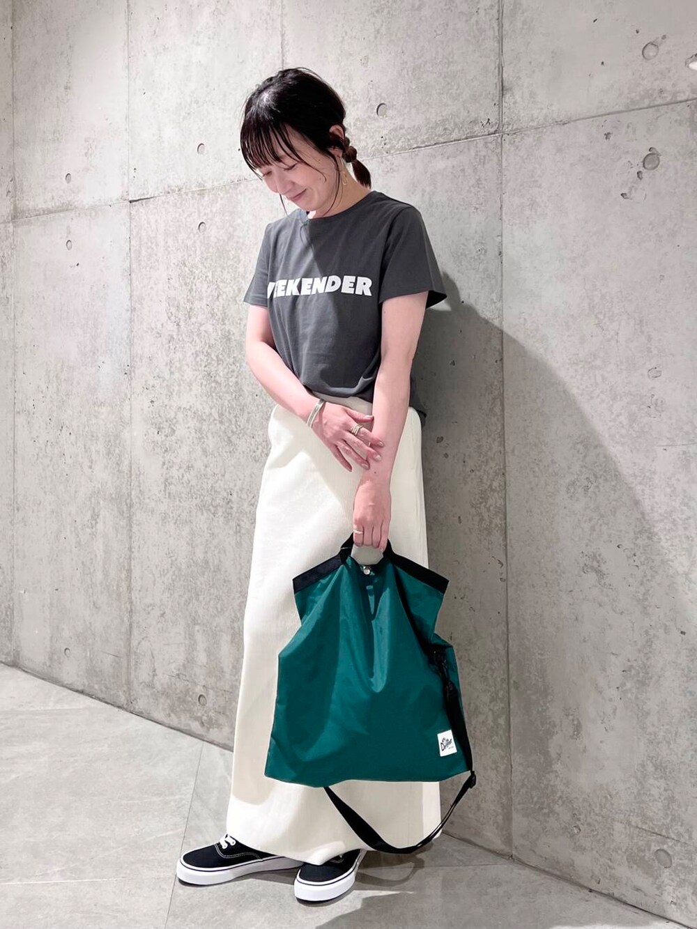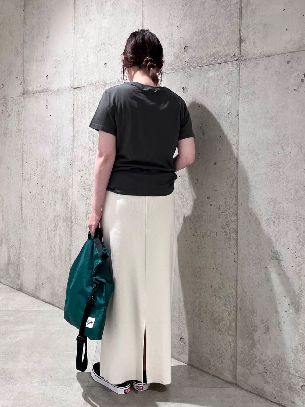 今回は、スッキリとしたリブスカートを合わせた、大人カジュアルコーディネート。