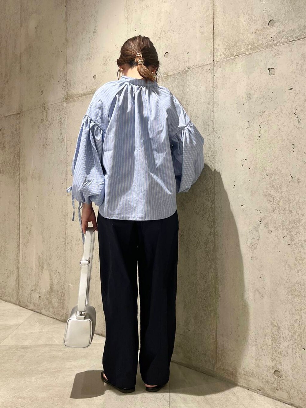 袖口のボリュームギャザーと、リボンがポイントのブラウスです。