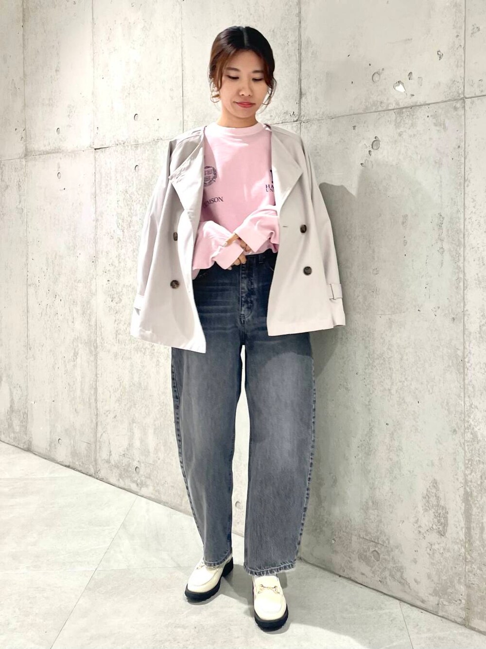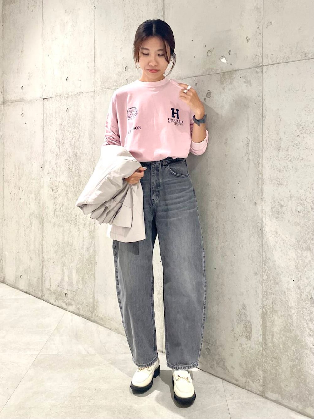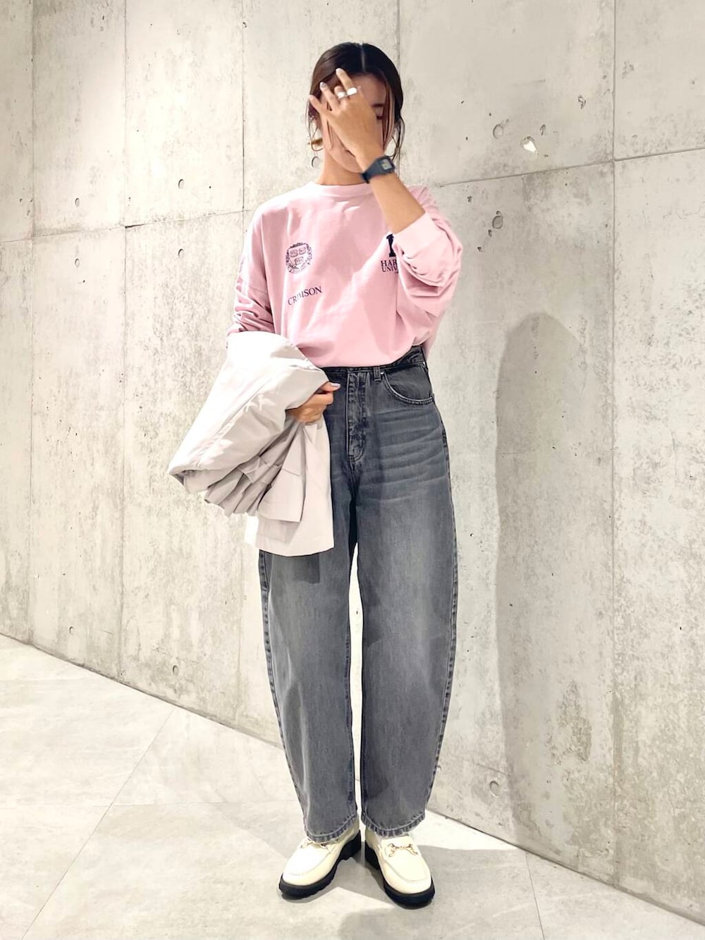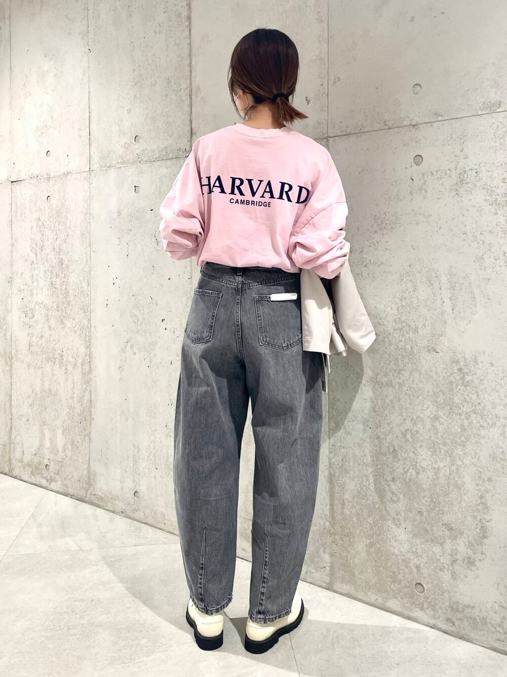 ロゴが印象的なピンクのロンTは、身幅かなりゆったりです。(無理やりボトムインしてます笑)