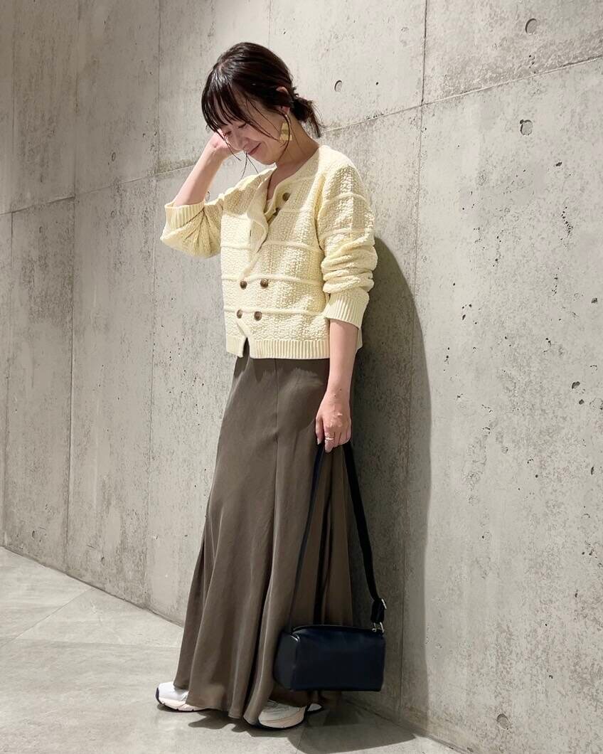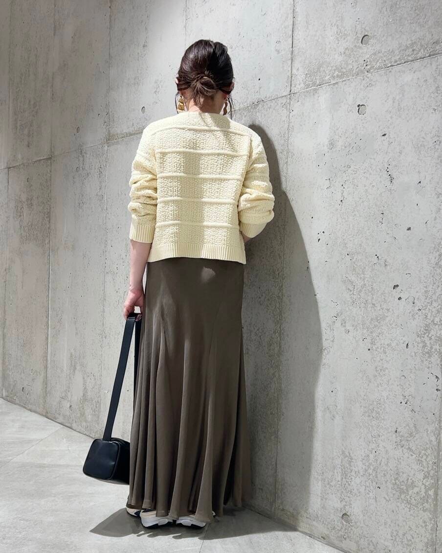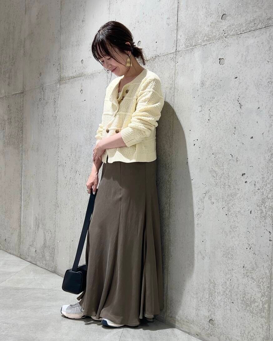 今回は、女性らしいフレアスカートを合わせた、フェミニンなコーディネート。