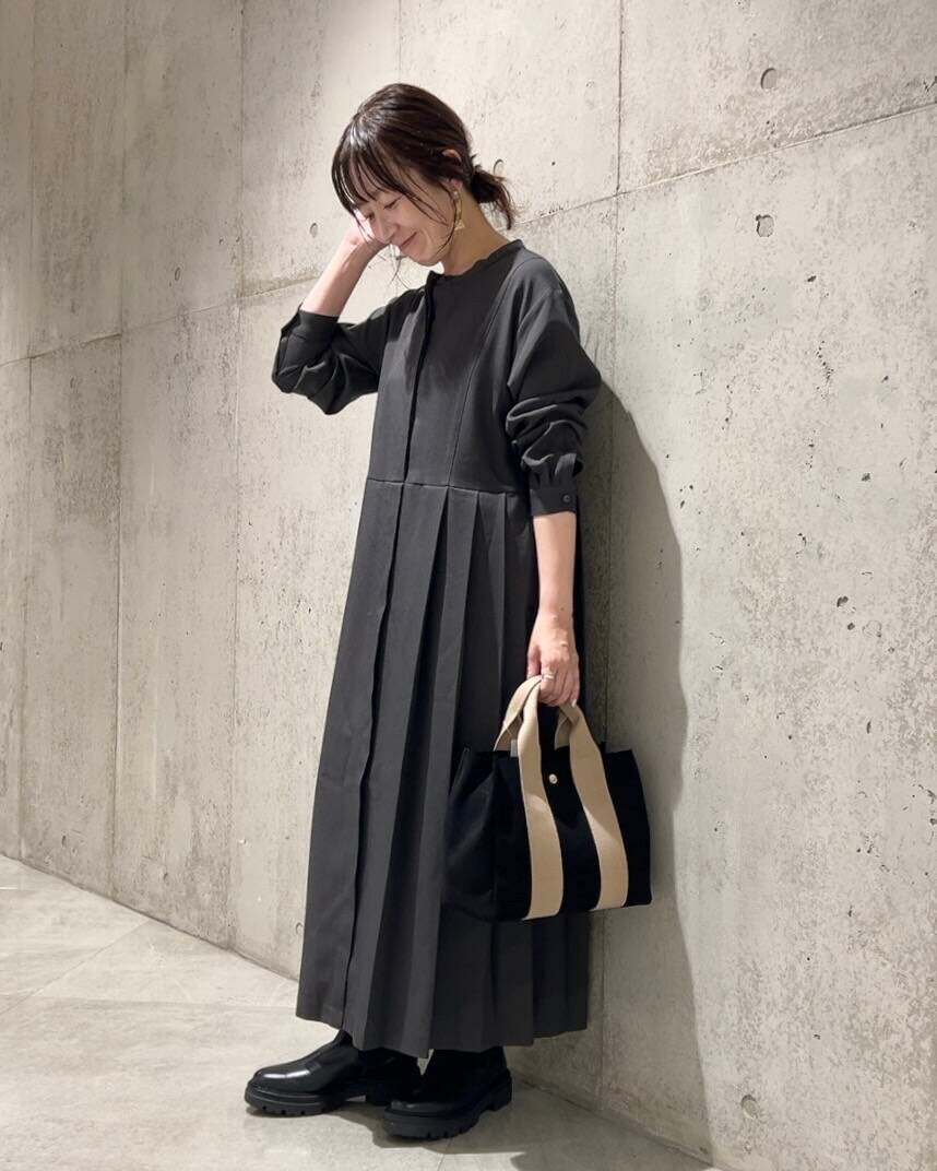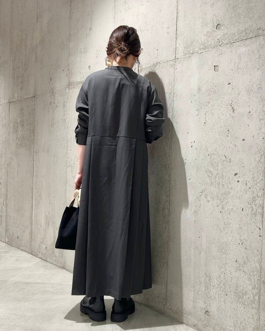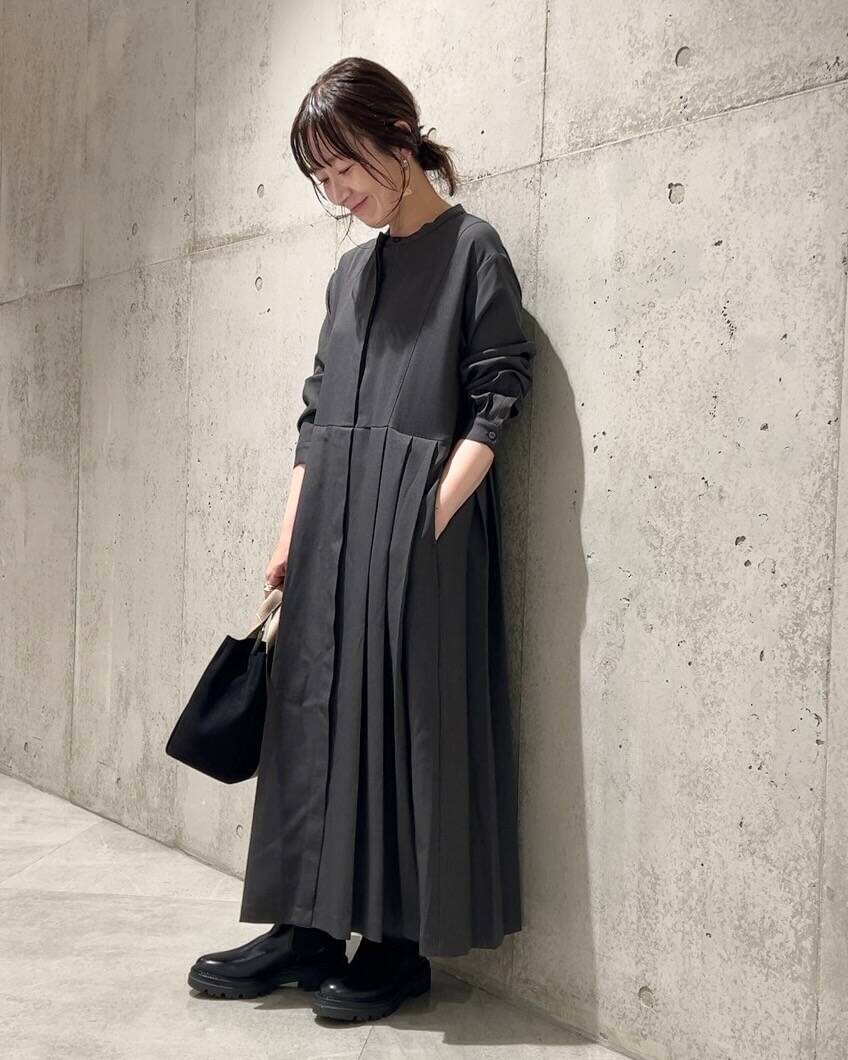 裾にかけて入ったサイドのプリーツがポイントの、ワンピースです。