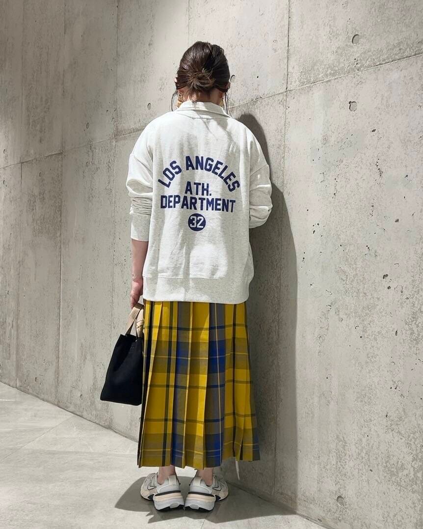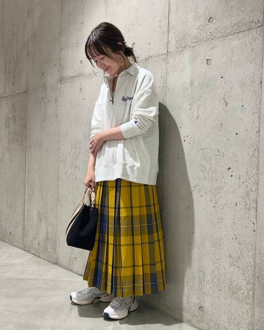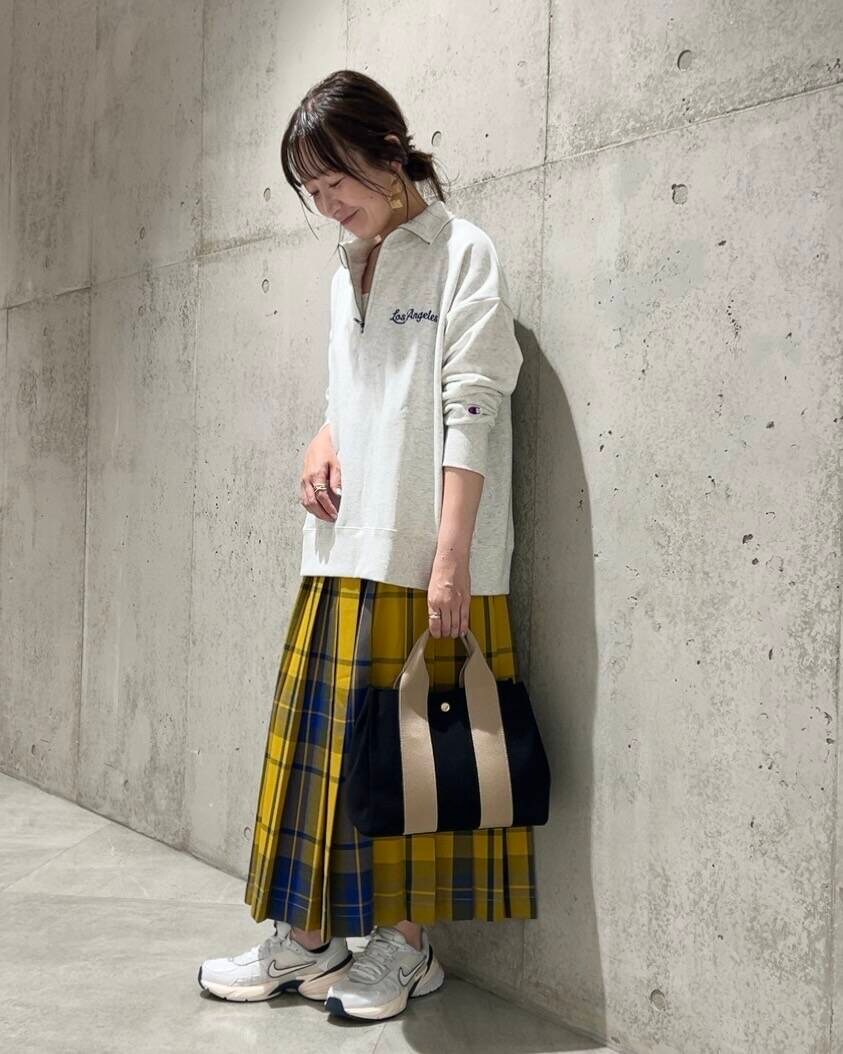 今回は、大人気のチェック柄プリーツスカートと合わせた、大人カジュアルです。