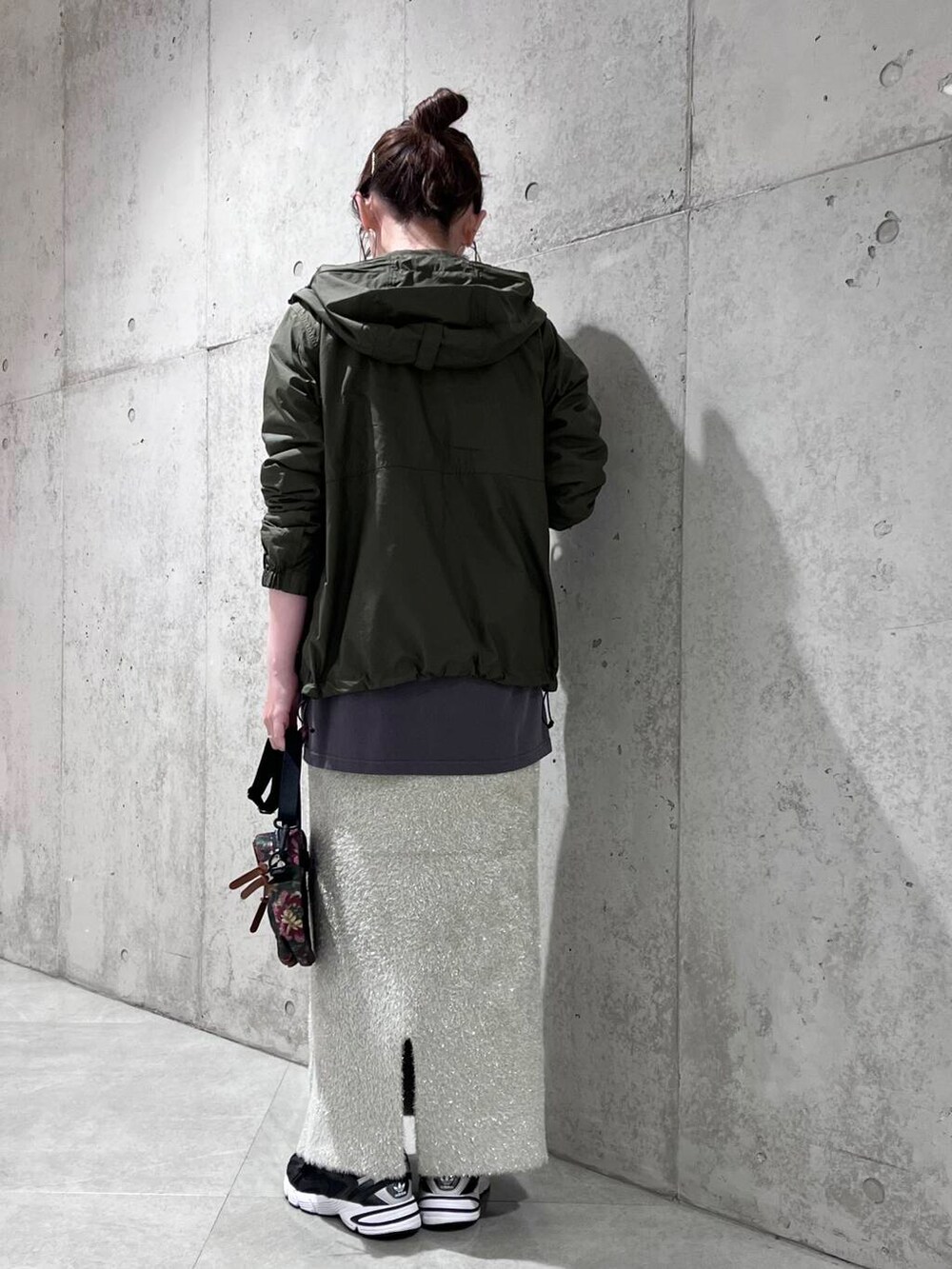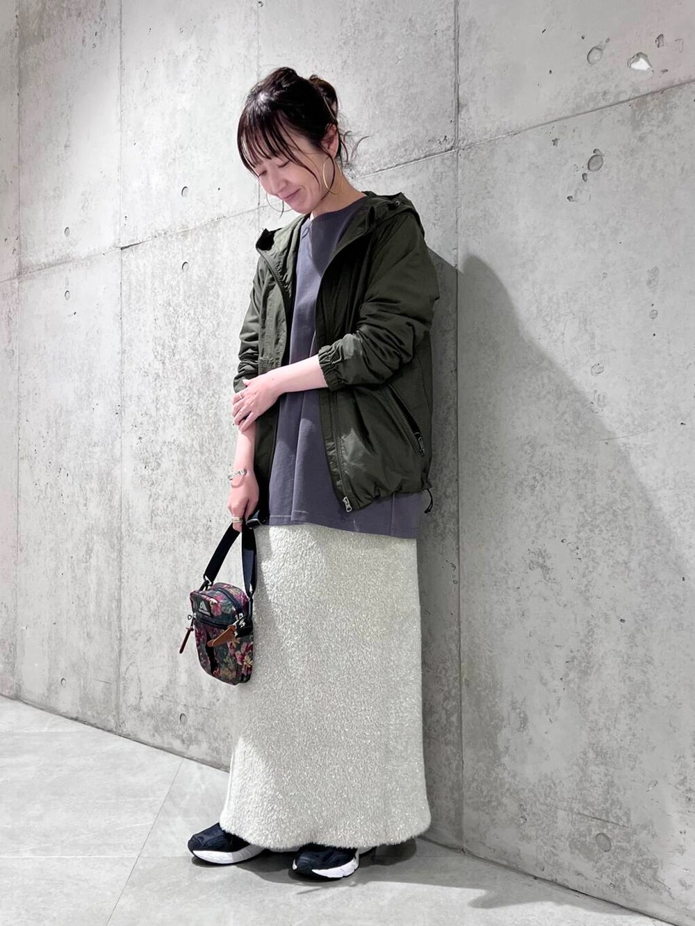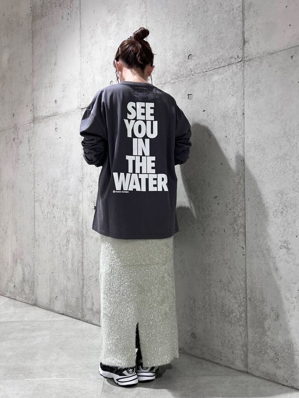 今回は、背中のプリントがアクセントになったロンTに、ニットスカートを合わせた、大人カジュアルコーディネートです。