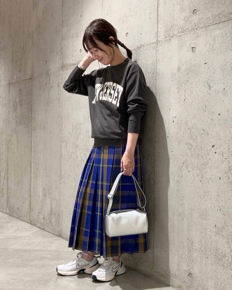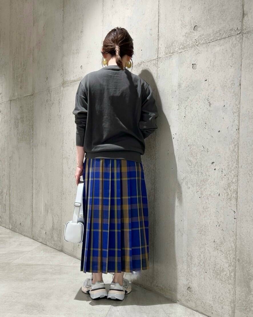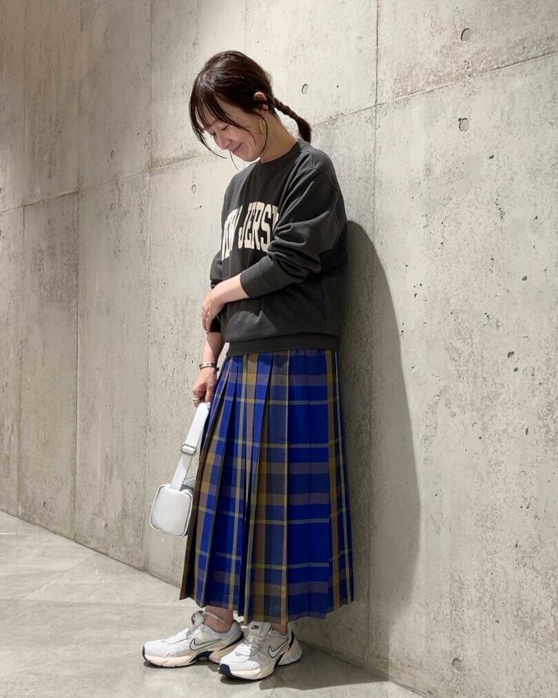 今回は、チェック柄のプリーツスカートを合わせた、大人カジュアルコーディネート。