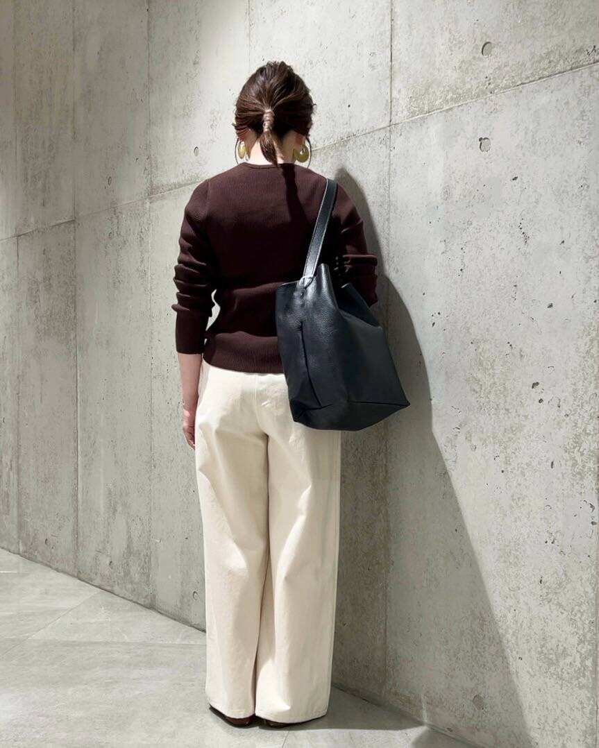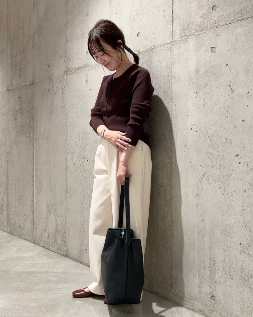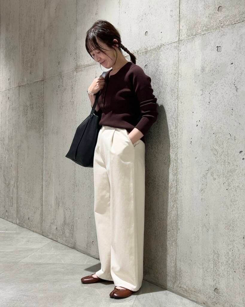 今回は、ワイドパンツと合わせて、キレイめコーディネートにしてみました。