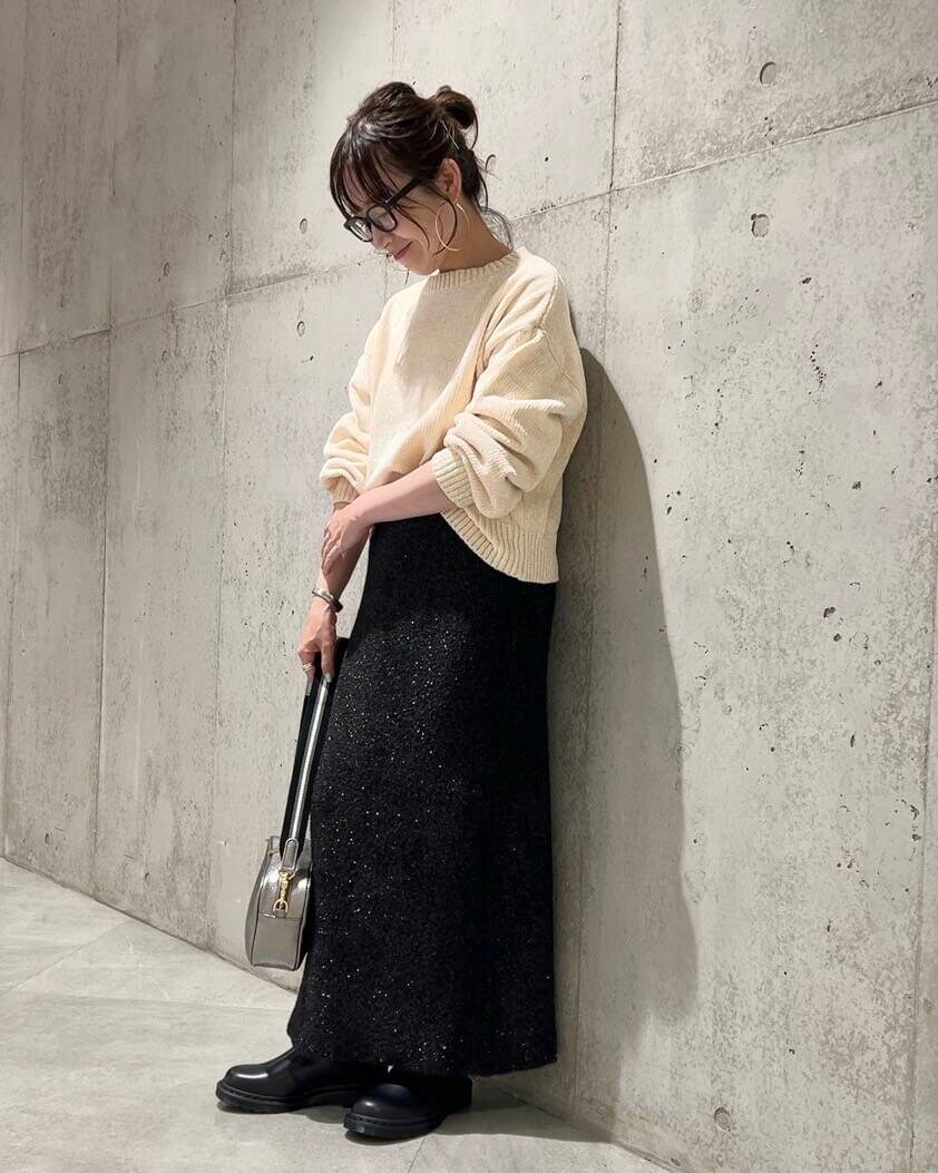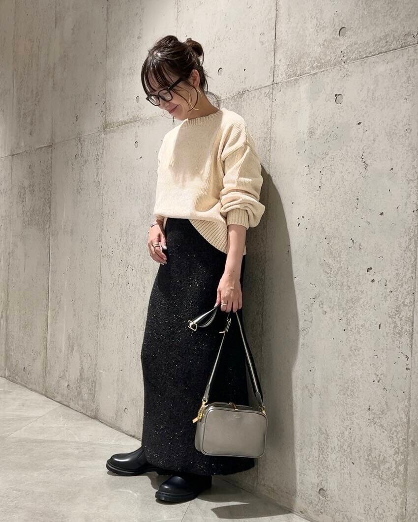 暗くなりがちな秋冬コーディネートに、ラメのスカートが華やかな印象にしてくれます。