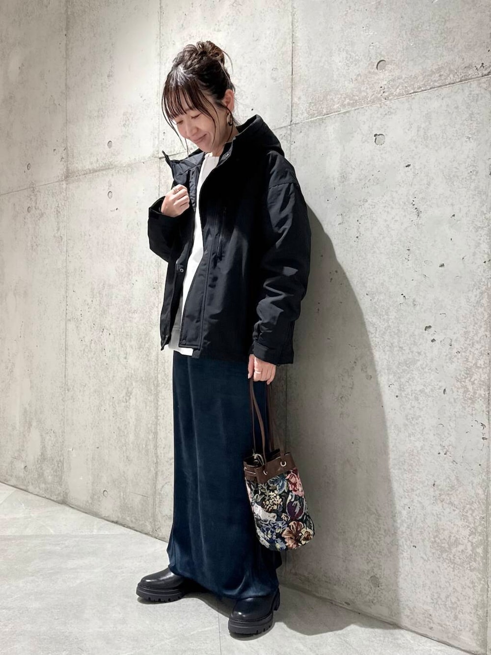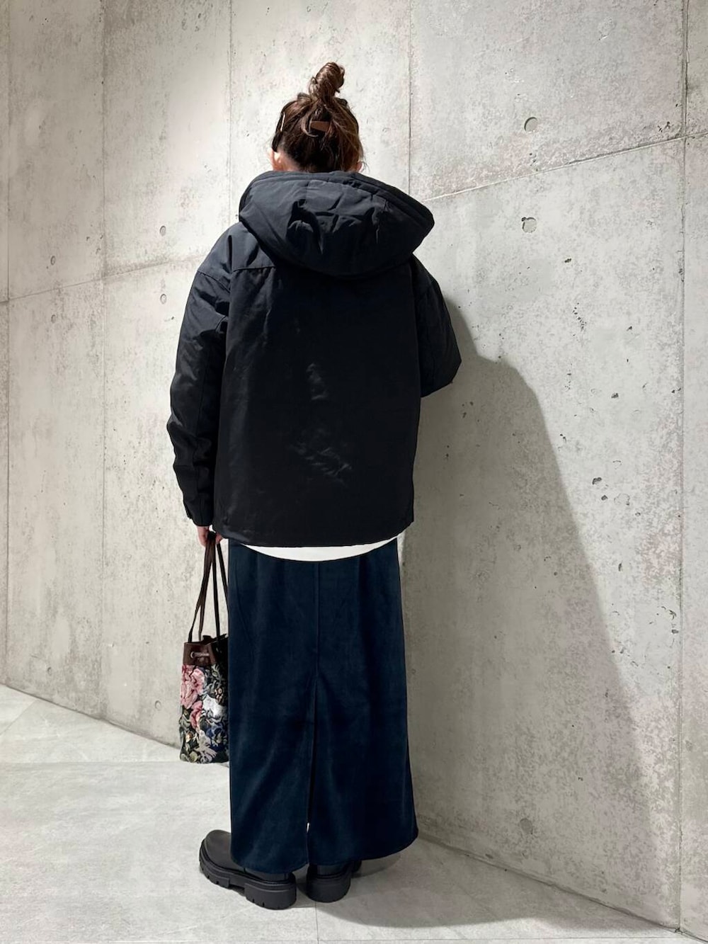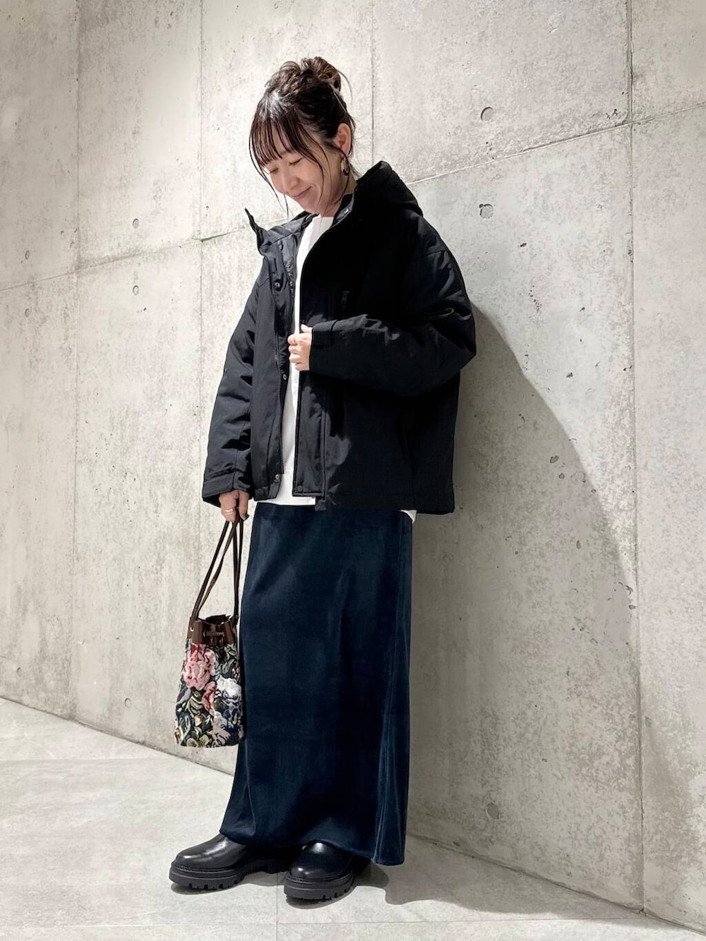 今回は、ベロアスカートと合わせて、落ち着いたカラーでまとめたカジュアルコーディネートです。