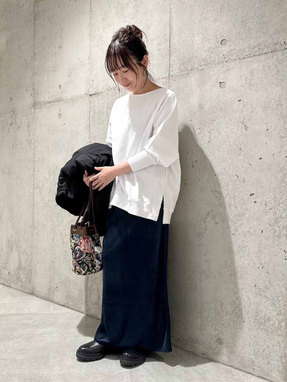 ジャガード柄のバッグをアクセントにしてみました。