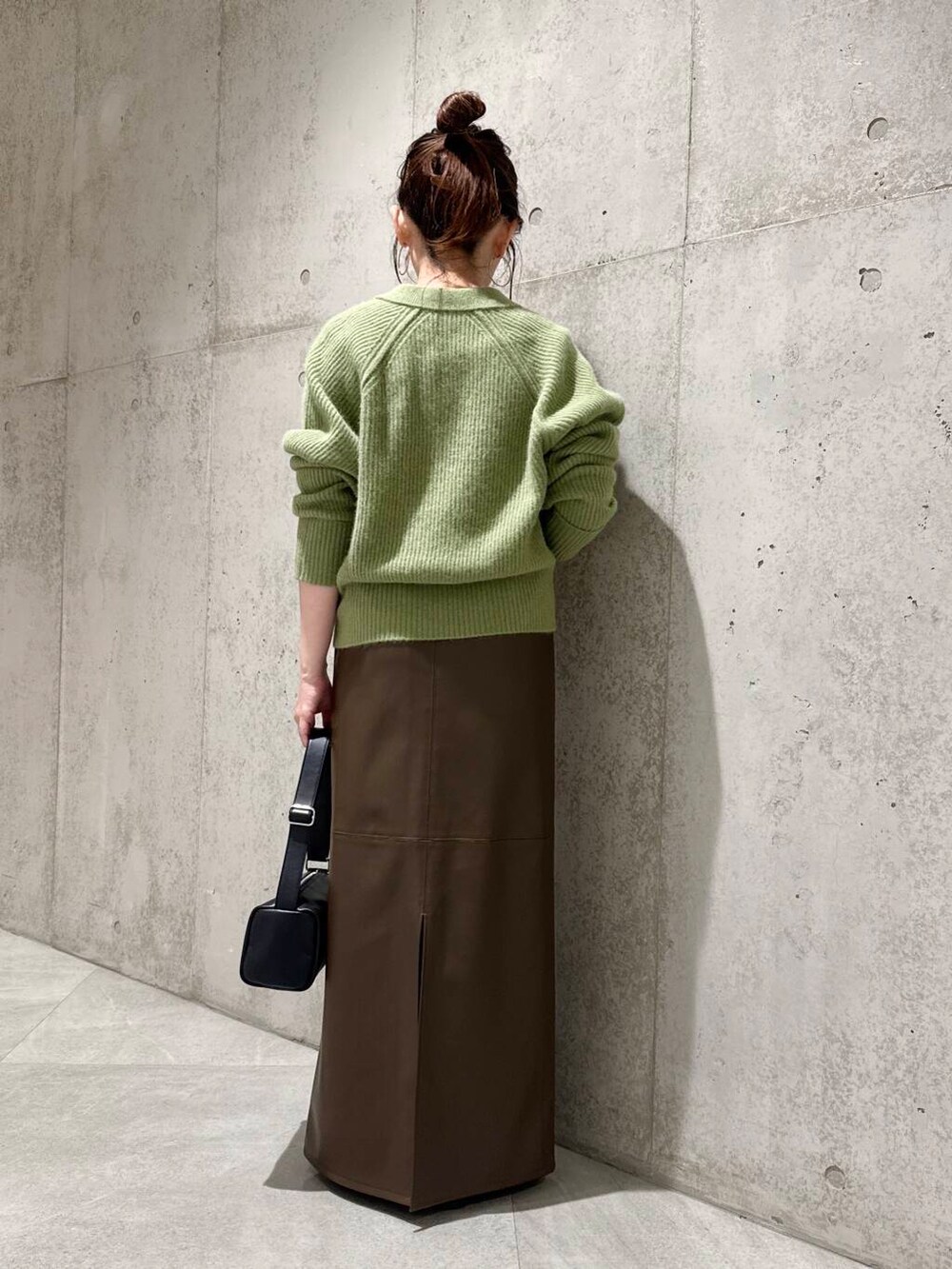 今回は、レザーライクなロングスカートを合わせて、大人カジュアルコーディネートです。