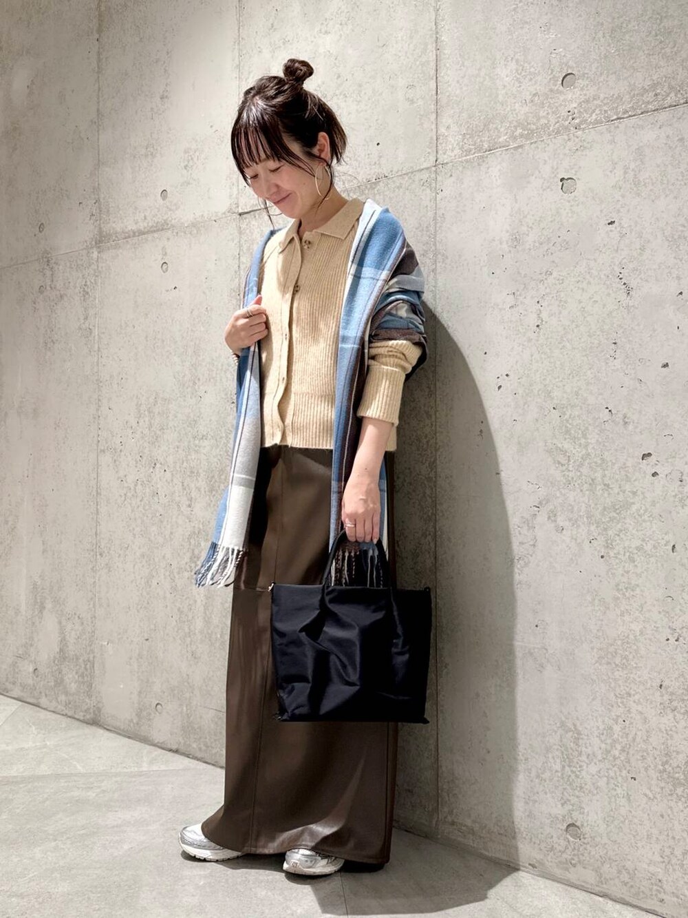 今回は、レザーライクなロングスカートを合わせて、大人カジュアルコーディネートです。