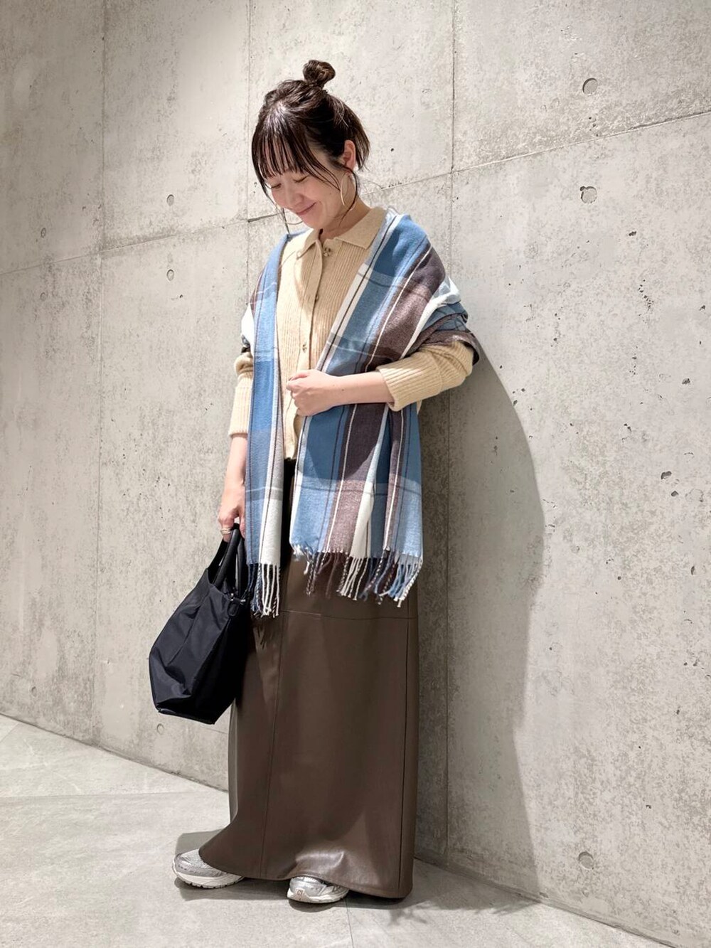チェック柄のマフラーは、寒さ対策として、広げてサラッと羽織るのもおすすめ。