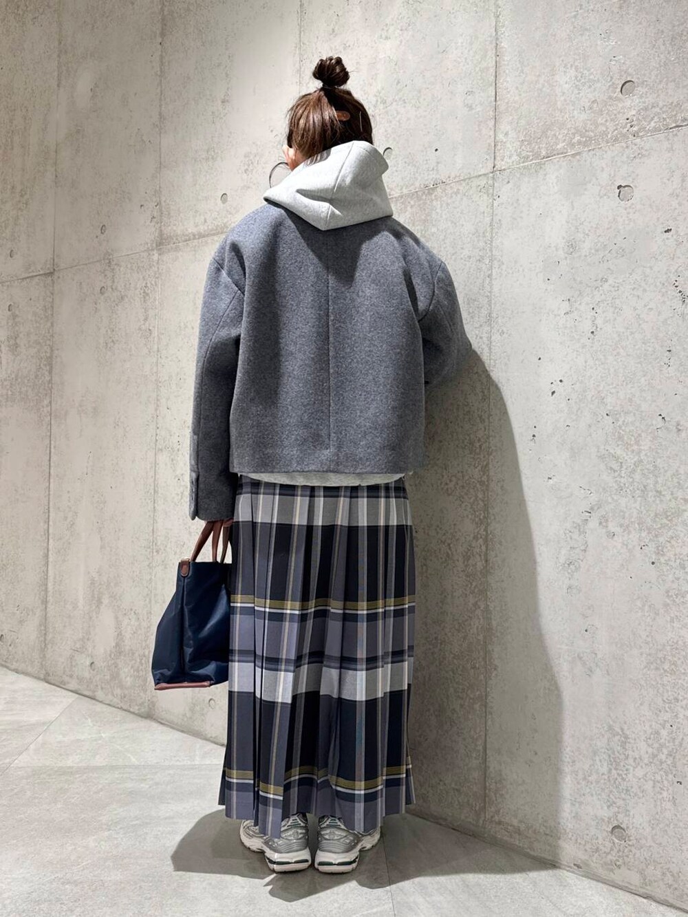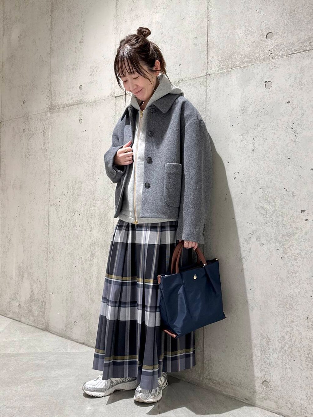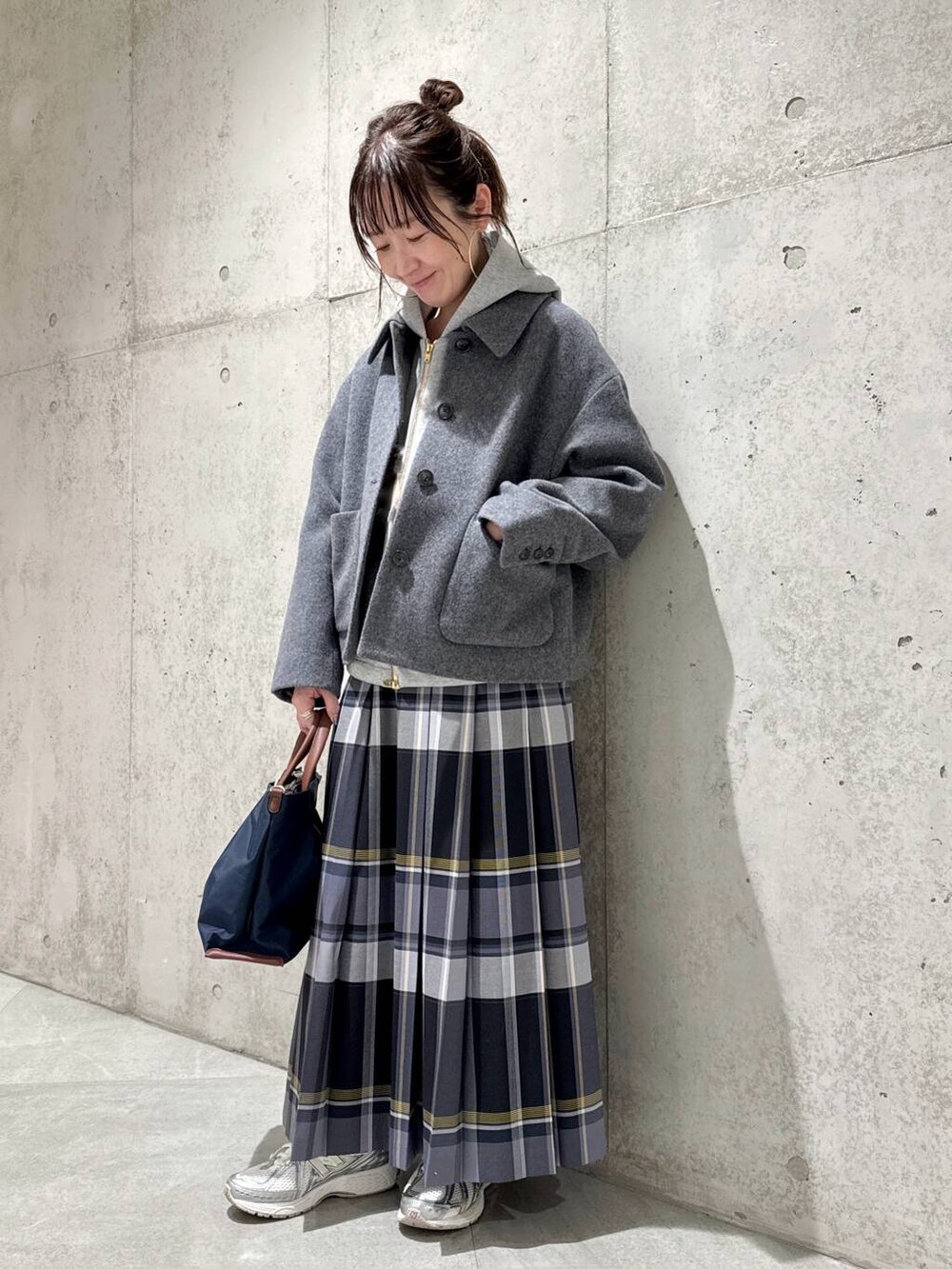 チェック柄のプリーツスカートで、大人カジュアルコーディネートに。