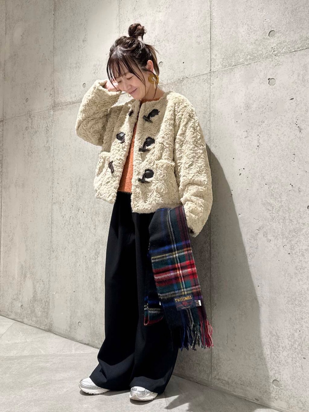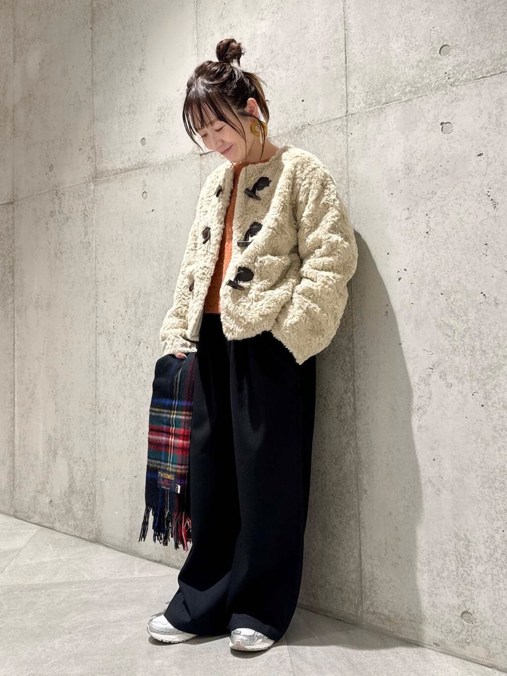 今回は、オレンジのカラーニットを差し色にしたコーディネート。