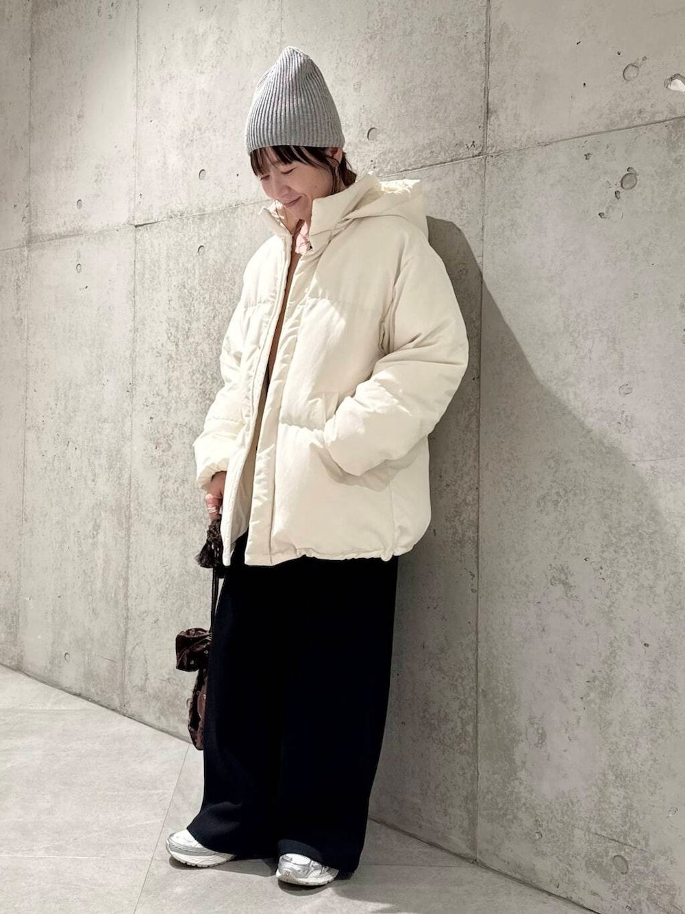 パンツは、足のラインが目立たない太めのシルエットで、楽な穿き心地です。